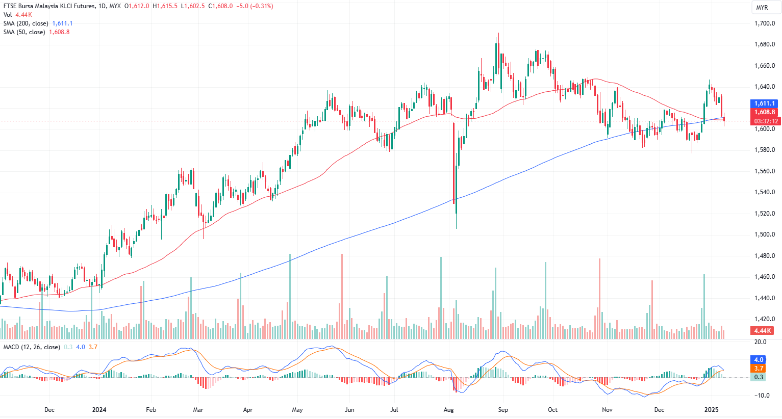 FKLI Jan month dropped 5 points or 0.31% to closed lower at 1608 on midday session. Selling pressure persisted on Bursa Malaysia, driven by a global bond sell-off that dampened investor appetite for equities.
