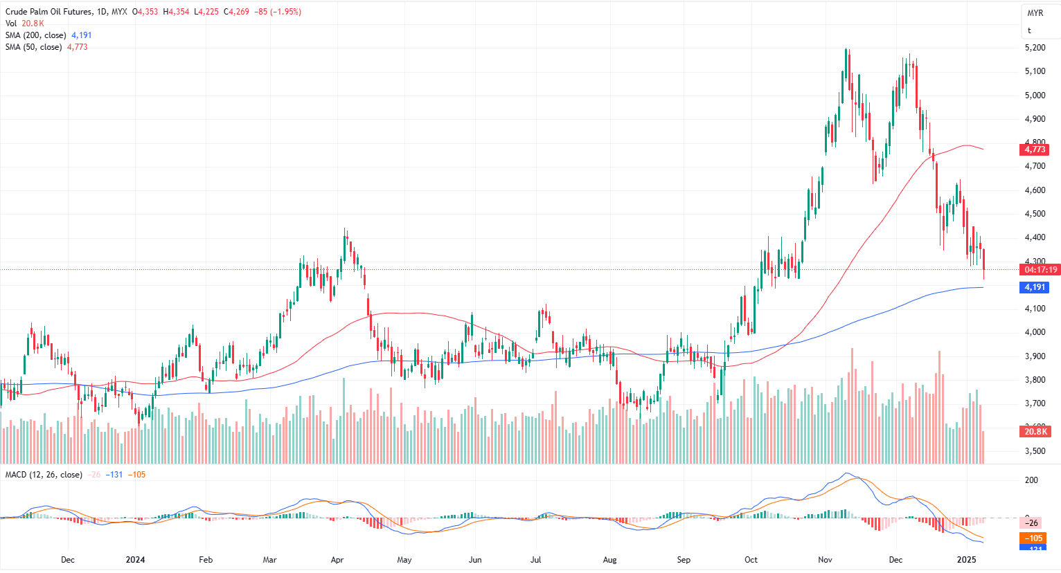 FCPO Mar month dropped 85 points or 1.95% to closed lower at 4269 on midday session. Malaysian crude palm oil futures dropped over 2% at the opening on Thursday, following weakness in competing edible oils.