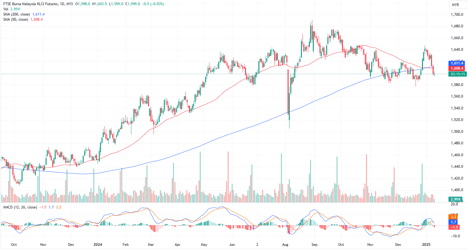 FKLI Jan month dropped 0.5 point or 0.03%, almost flat at 1599 on midday session. The domestic market saw some bargain-hunting following recent losses, which had pushed the FBM KLCI to just above the critical 1,600 psychological level.