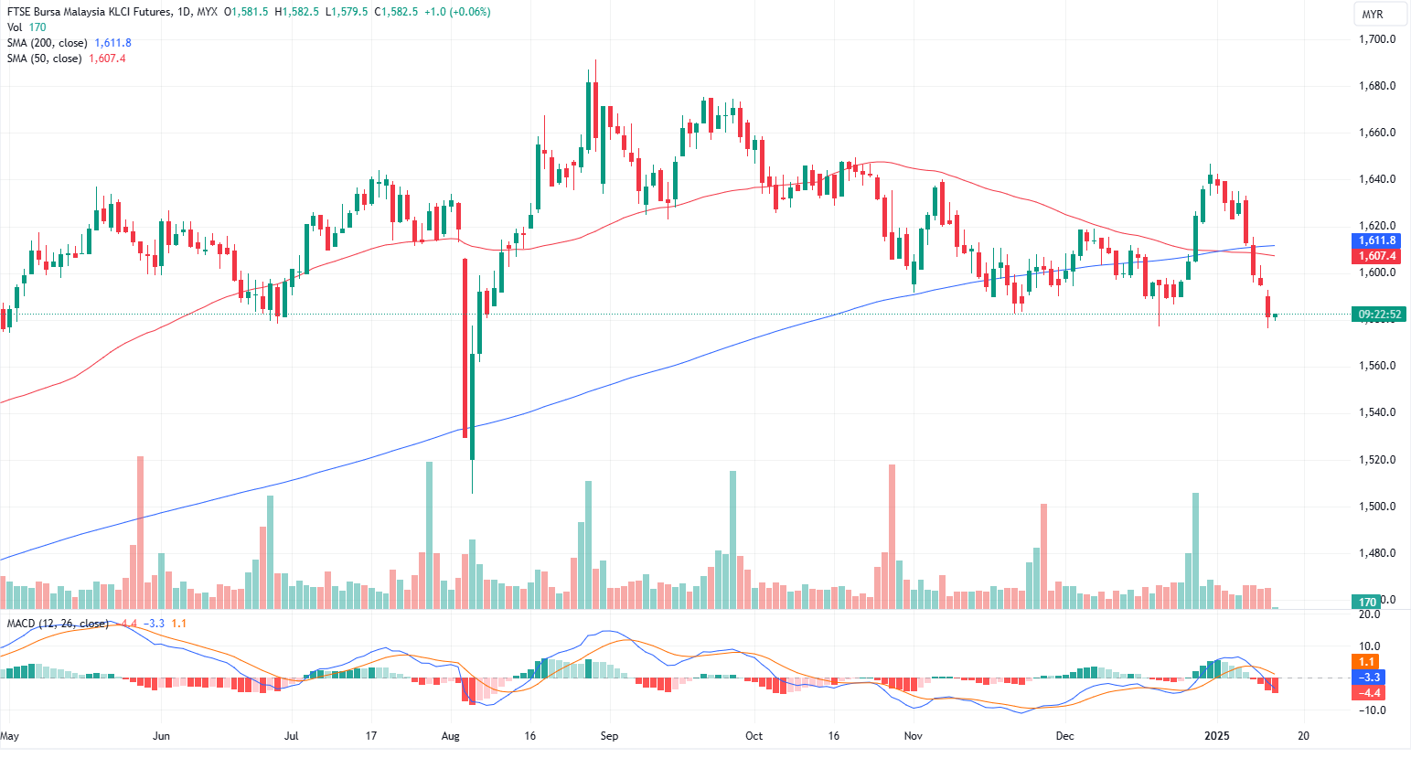 FKLI Jan month sinks 13.5 points or 0.85% to closed lower at 1581.5. The FBM KLCI experienced broad-based declines on Monday, with more than 900 stocks closing lower, highlighting the persistent weak sentiment in the market.