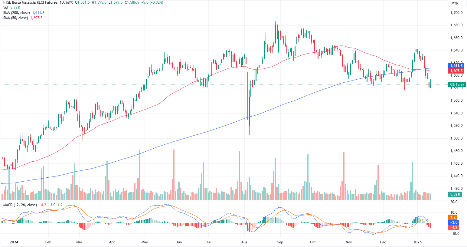 FKLI Jan month dropped 17 point or 1.07% to closed lower at 1578 on midday session. The FBM KLCI bounced back from a six-month low to close higher at midday, but it stayed well below the key 1,600 psychological mark.