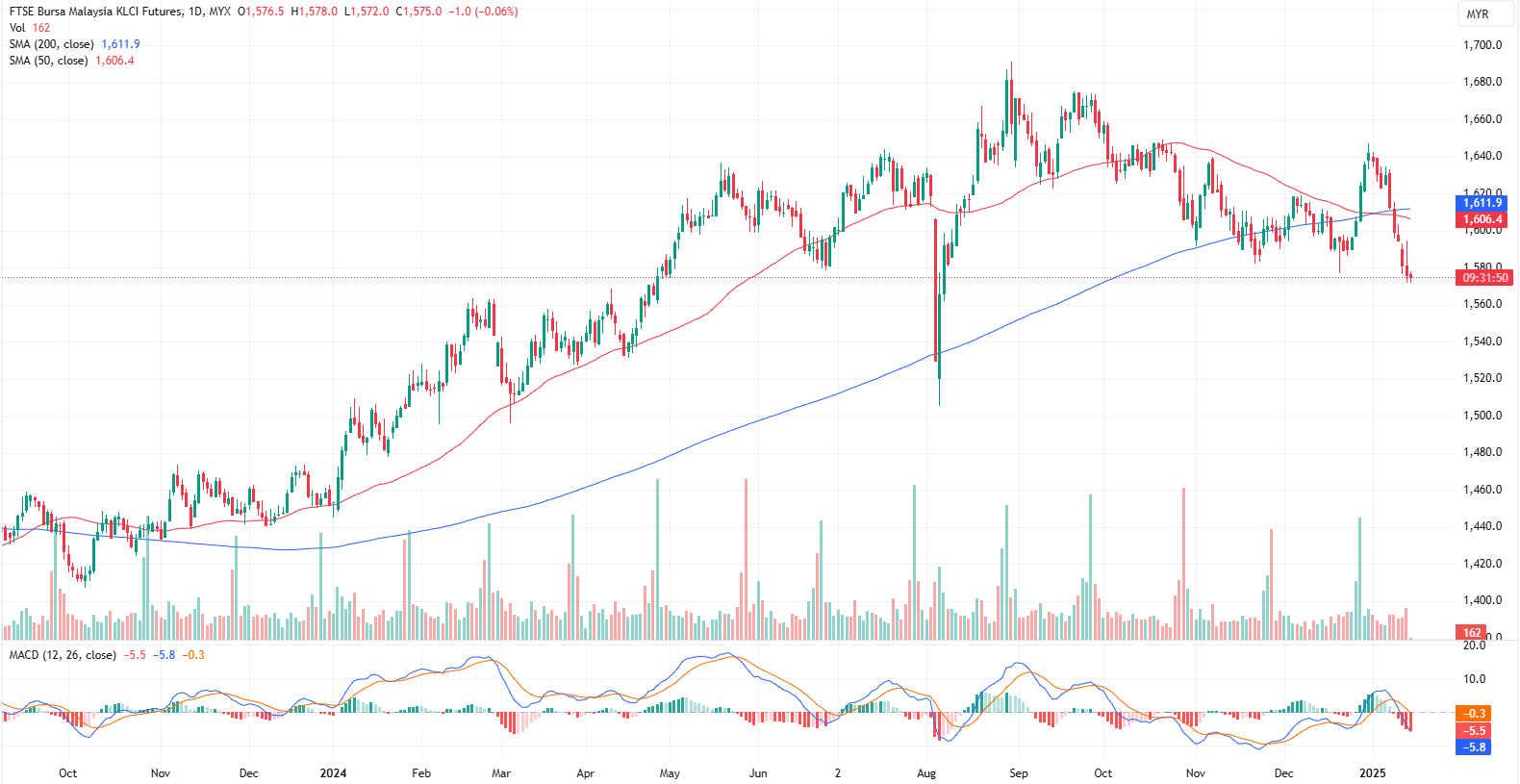 FKLI Jan month dropped 5.5 points or 0.35% to closed lower at 1576. The FBM KLCI saw a brief rebound before closing at its lowest level since June 2024 on Tuesday, as market sentiment deteriorated. Stocks such as Sunway, YTL Power, and CIMB Group weighed heavily on the index.