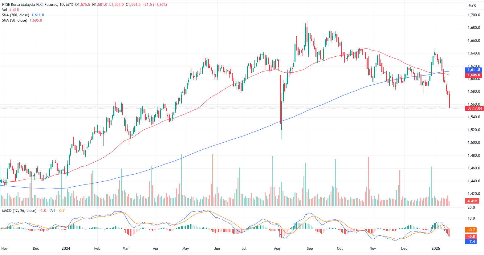 FKLI Jan month dropped 21.5 point or 1.36% to closed lower at 1554.5 on midday session. The FBM KLCI faced another sharp decline, with over 900 stocks slipping into the red as equity investment conditions continued to deteriorate.