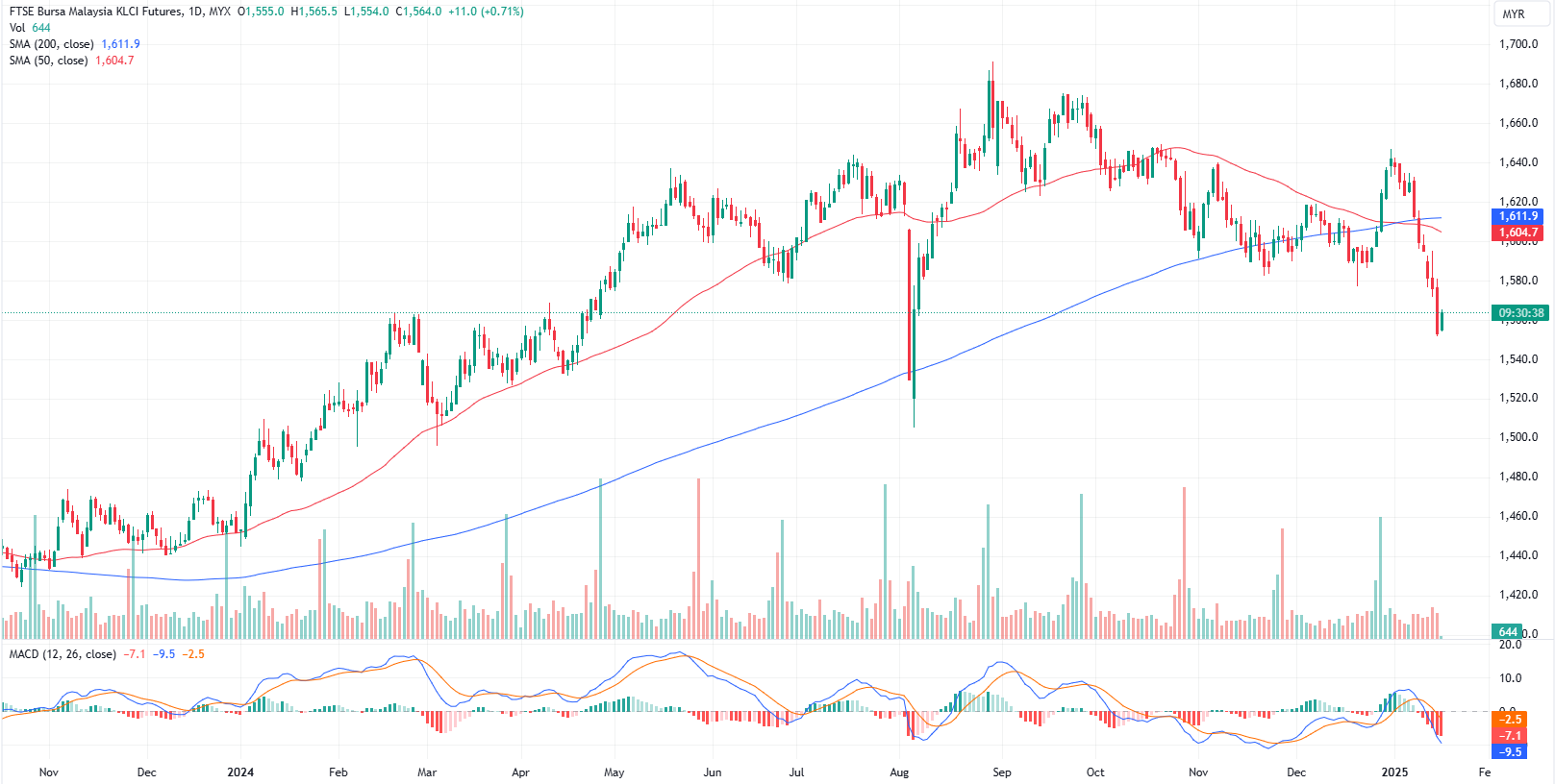 FKLI Jan month dipped 23 points or 1.46% to closed lower at 1553. Bursa Malaysia slipped back into negative territory on Wednesday, with nearly 1,000 counters ending in the red as investors continued to sell off shares amid subdued market sentiment.