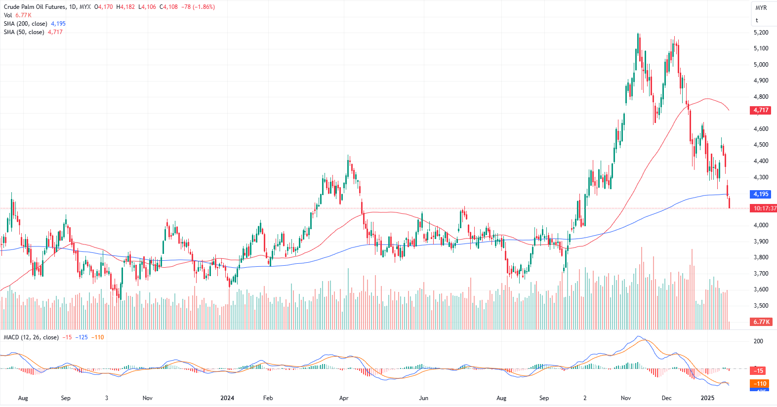 FCPO Apr month contract dropped 82 points or 1.92% to closed lower at 4186. Malaysian crude palm oil futures declined for the third consecutive session on Thursday, closing at their lowest level in over three months due to weak performance in competing vegetable oils and subdued demand.