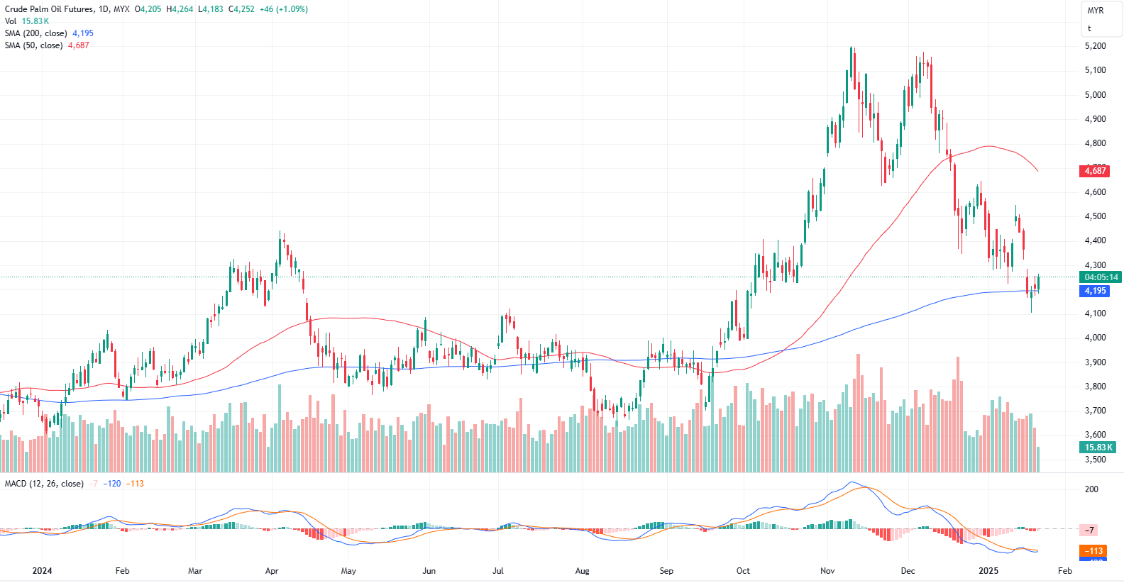 In daily chart, the palm price continues to trading in upward momentum at the bottom of downward channel, we see the price supported above 4235 to 4230 range and likely to remain in positive note, on short term technical buying. Resistant see at 4250 to 4255, breaking above could see further highest, beware the strong resistant at 4280 to 4285 area. The immediate support and resistance levels are identified at 4233 and 4258, respectively.