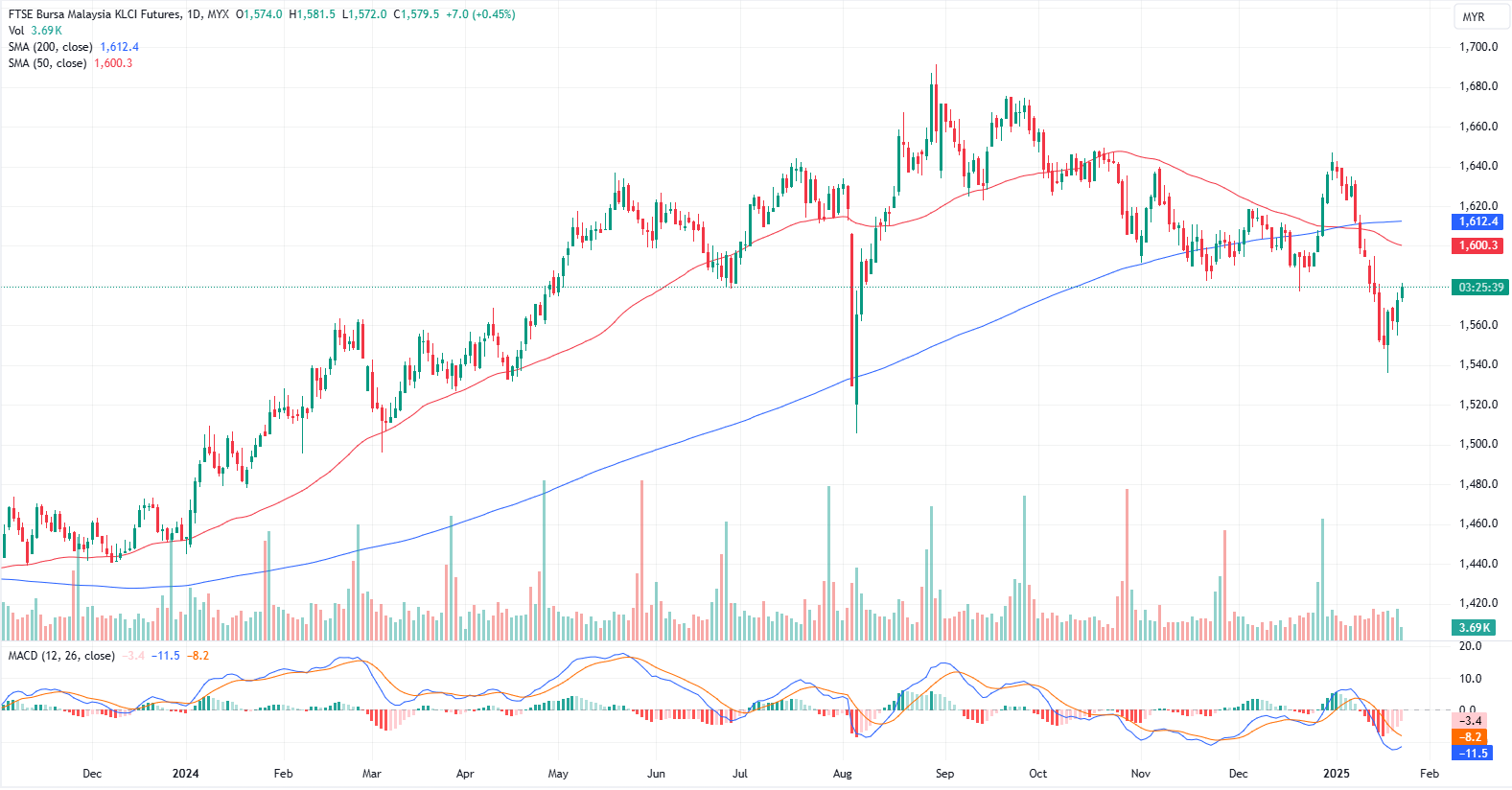 FKLI Jan month rose 7 points or 0.45% to closed higher at 1579.5 on midday session. The FBM KLCI is set for a fourth consecutive day of recovery, driven by improved global investor sentiment as President Donald Trump's trade tariffs remain unrealized and US technology companies report positive earnings.