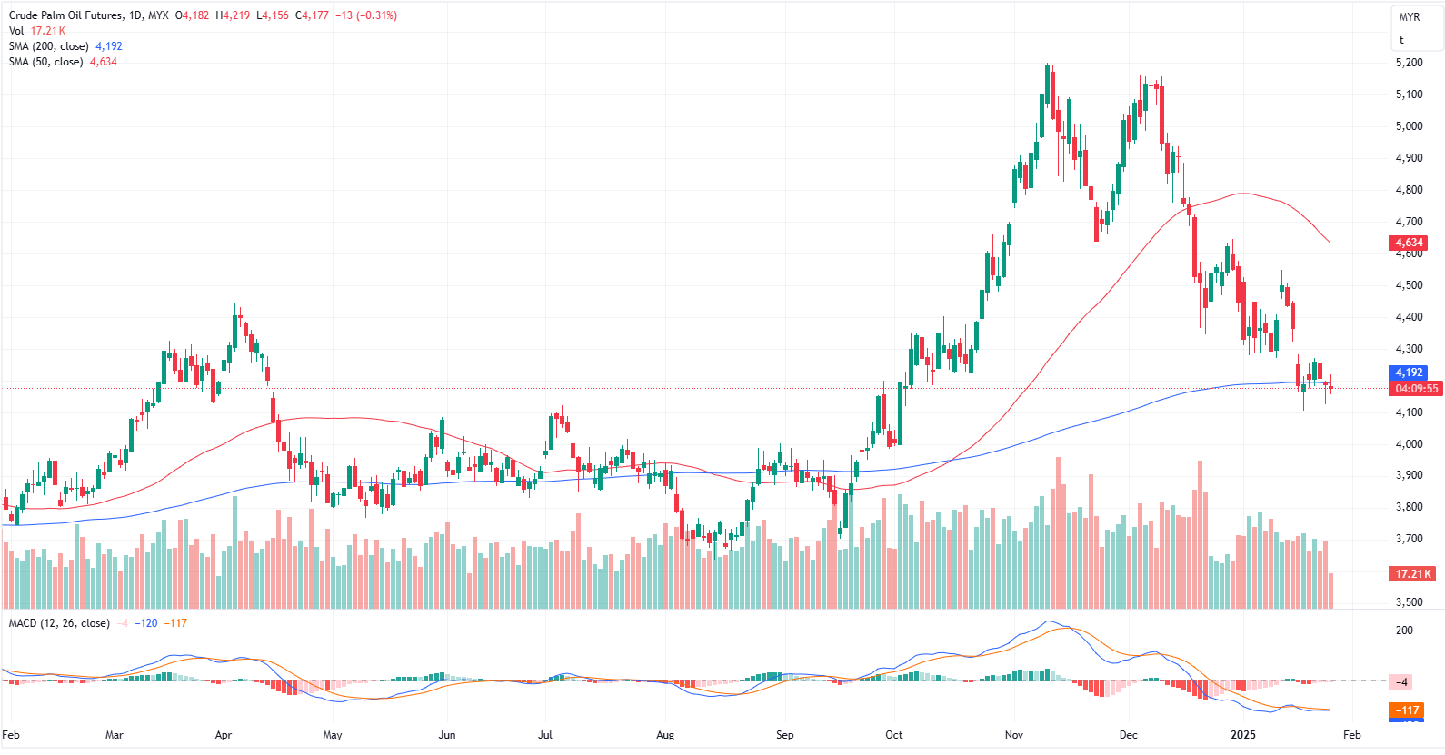 FCPO Apr month dropped 13 points or 0.31% to closed lower at 4177 on midday session. Malaysian crude palm oil futures traded within a narrow range on Friday, weighed down by weakness in competing vegetable oils, but remained on track for a modest weekly gain.