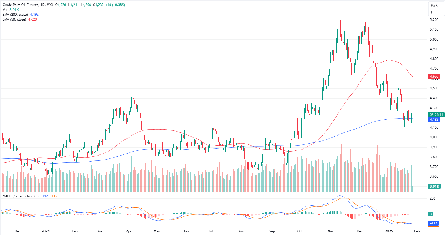 FCPO Apr month rose 16 points or 0.38% to closed higher at 4232 on midday session. Malaysian crude palm oil futures traded within a narrow range on Monday, pressured by weakness in the Chicago soyoil contract and expectations of lower January exports from the country.