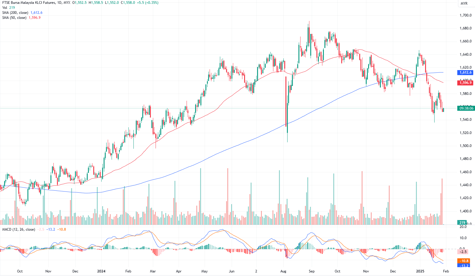 FKLI Jan month dropped 7 points or 0.45% to closed lower at 1552.5. The FBM KLCI ended at its intraday low on Monday, weighed down by YTL-related counters, as cautious investors remained on the sidelines, mirroring the trend across regional markets.