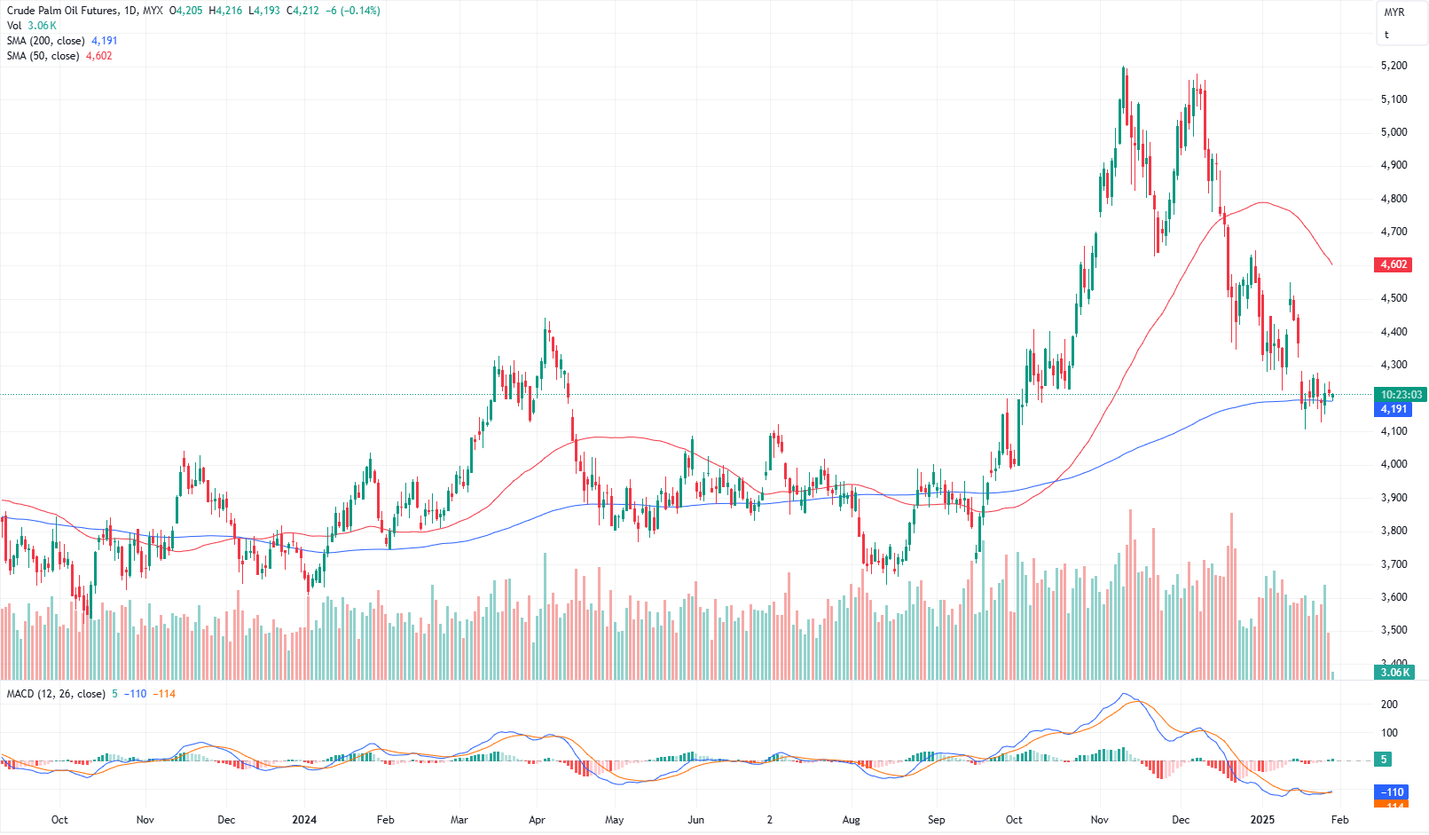 The palm price remains hovering at the bottom area of the downward channel in daily chart, the bigger pictures remain bearish. While in hourly chart the price trading in very tight range on previous session, and remain within a sideway consolidation, top of the range at 4275 to 4280, while bottom at 4130 to 4125, trading above the middle of the range 4200 to 4205, could remain buy plan, otherwise, selling may persist. On the buy side, if breaking above 4250 range likely reaching the top of the sideway range. Beware of any sentiment changes. The immediate support and resistance levels are pinpointed at 4204 and 4225, respectively.