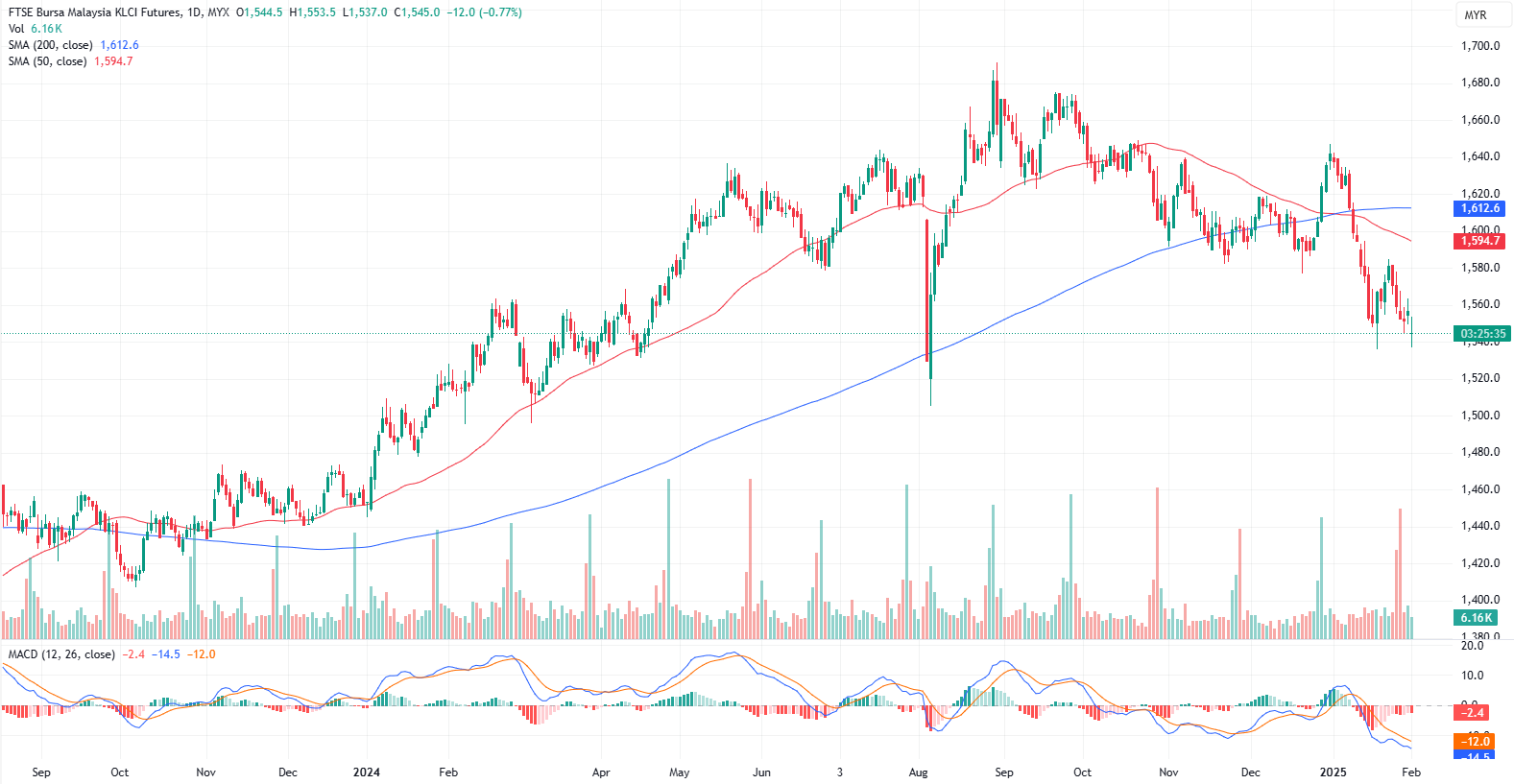 FKLI Jan month dipped 12 points or 0.77% to closed lower at 1545 on midday session. The FBM KLCI is set for another volatile session as the U.S. announcement of tariffs on Mexico, Canada, and China over the weekend has ignited a trade war, rattling global equity markets.