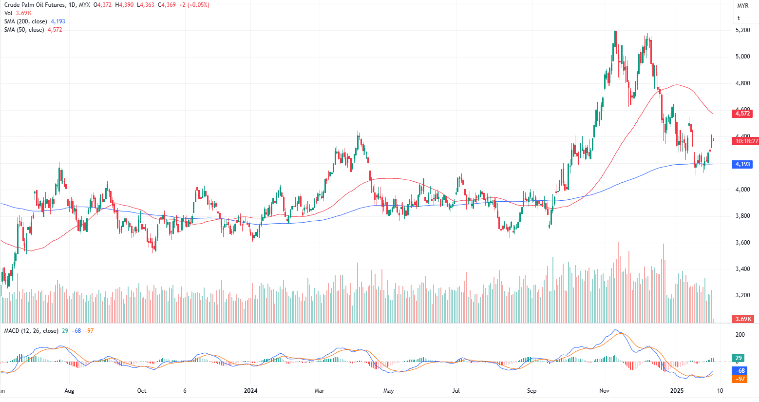 Palm oil prices continue to hover within the downward channel on the daily chart, reaching the resistance level at 4410–4415 before pulling back. We maintain a neutral outlook for the current formation. Our strategy remains to buy on retracements, with support identified in the 4360–4365 range. A breakout above the resistance line could potentially drive prices toward 4440 or higher. Conversely, failure to break the resistance line may present selling opportunities, leading prices to trade back within the downward channel. Beware of any sentiment changes. The immediate support and resistance levels are pinpointed at 4364 and 4391, respectively.