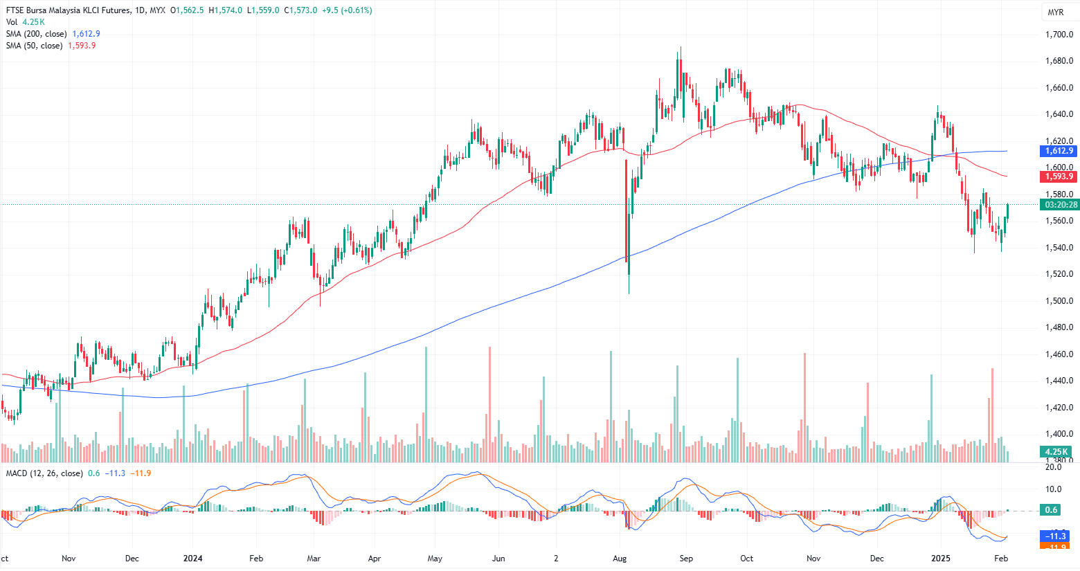 FKLI Feb month rose 9.5 points or 0.61% to closed higher at 1573 on midday session. The FBM KLCI climbed to its highest level in over a week as the local market extended its recovery, supported by easing concerns over inflation and tariff risks.