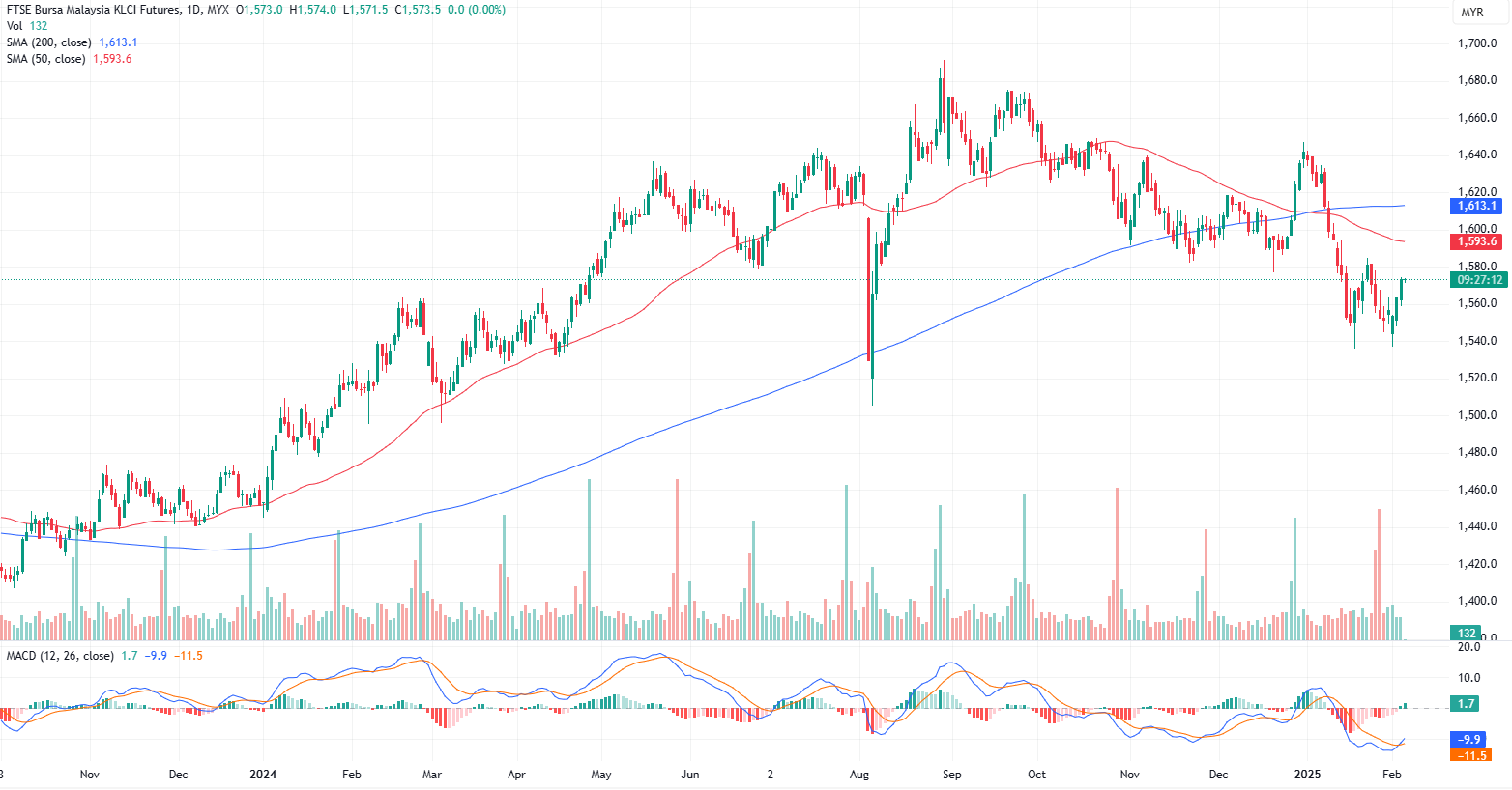 FKLI Feb month rose 10 points or 0.64% to closed higher at 1573.5. The FBM KLCI ended higher on Wednesday, extending its upward momentum as continued bargain hunting bolstered investor confidence.