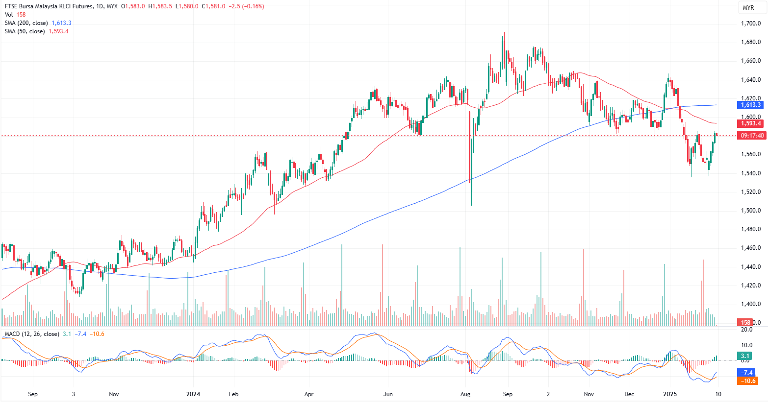 FKLI Feb month rose 10 points or 0.64% to closed higher at 1583.5. The FBM KLCI index surged sharply on Thursday, driven by last-minute buying interest, marking its third consecutive session of gains and aligning with the positive momentum in regional markets.