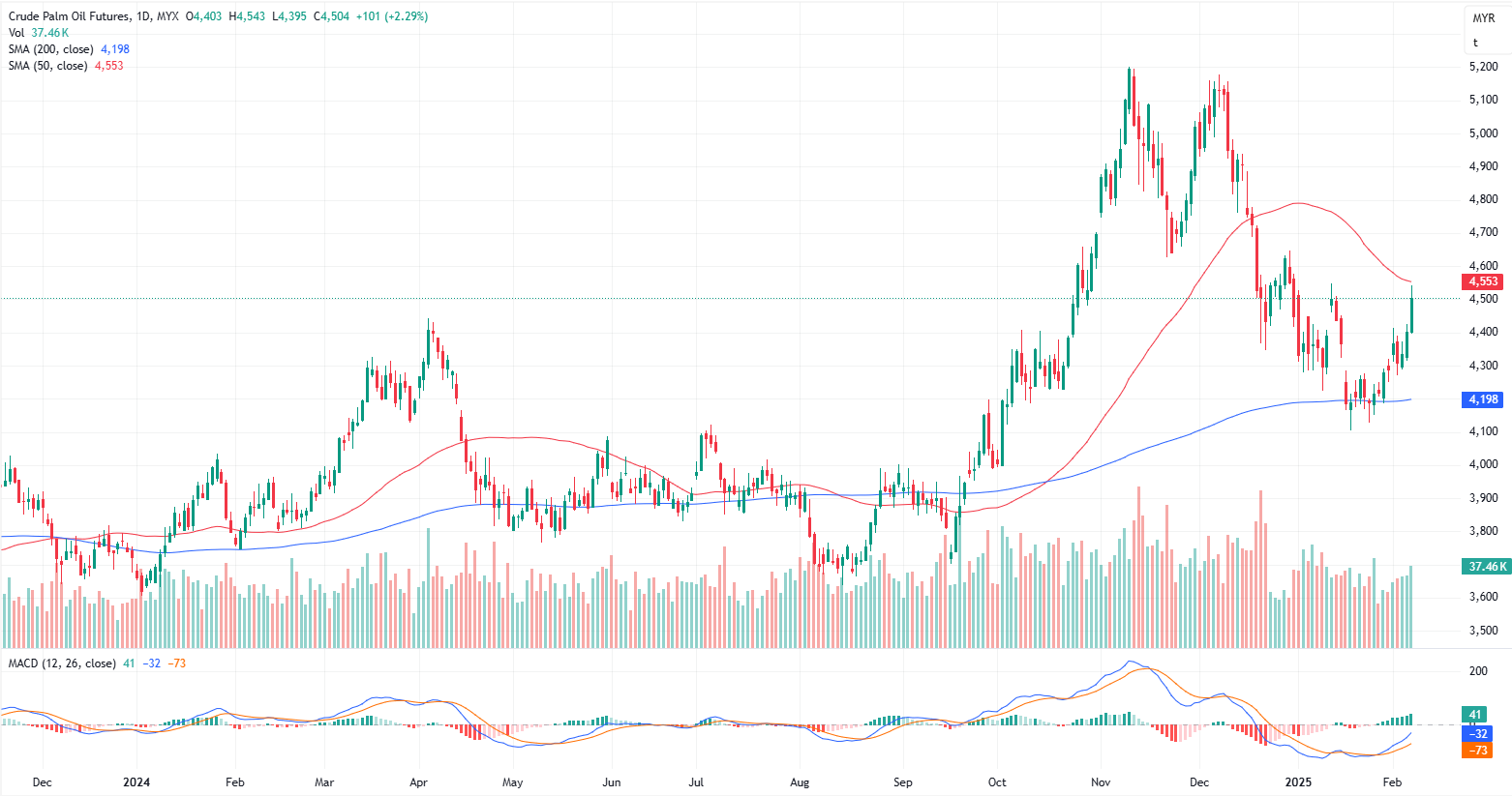 FCPO Apr month contract rose 101 points or 2.29% to closed higher at 4504. Malaysian crude palm oil futures ended higher on Friday, marking their third consecutive week of gains, driven by a weaker ringgit, expected Ramadan demand, and seasonal production drops.