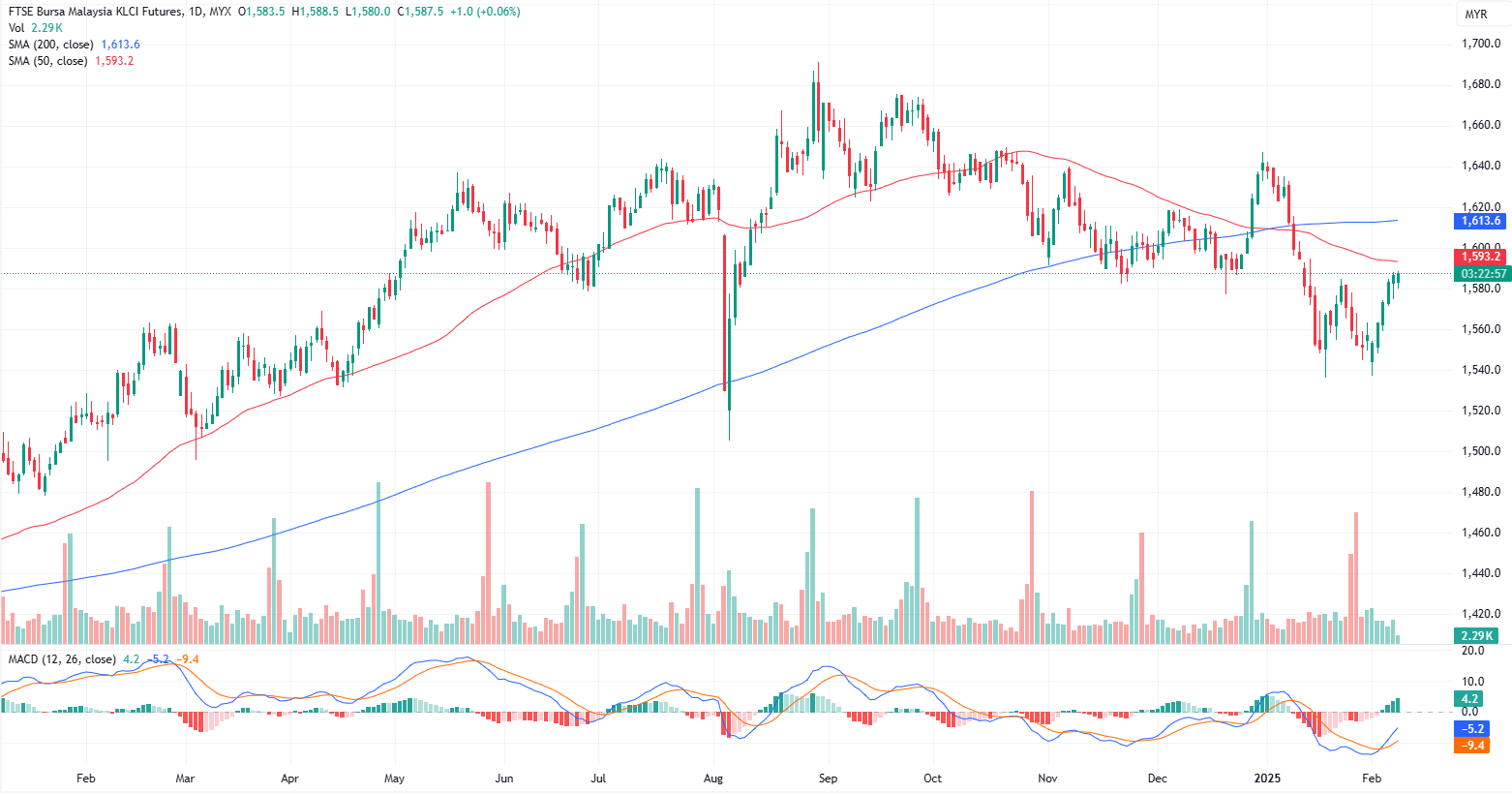 FKLI Feb month rose 1 point or 0.06% to closed slightly higher at 1587.5 on midday session. The FBM KLCI trimmed earlier losses as global equities rebounded from the shock of a new tariff announcement by US President Donald Trump, proposing higher import taxes on steel and aluminum along with reciprocal taxes on trading partners.