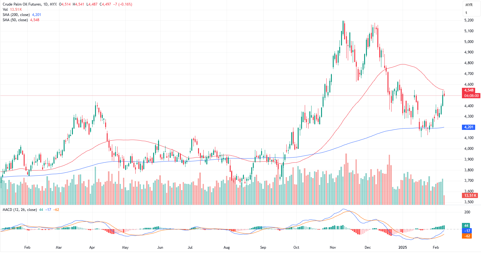 The FCPO active month contract is displaying downward-biased momentum on a technical correction in the hourly chart. It is currently hovering around the support level of 4285–4290, with the resistance of the downward channel identified at 4525–4530. A breakout above this resistance could signal further gains, while failure to break may invite renewed selling pressure. In the bigger picture on the daily chart, the major resistance remains at the 4545–4550 range. The immediate support and resistance levels are identified at 4487 and 4508, respectively.