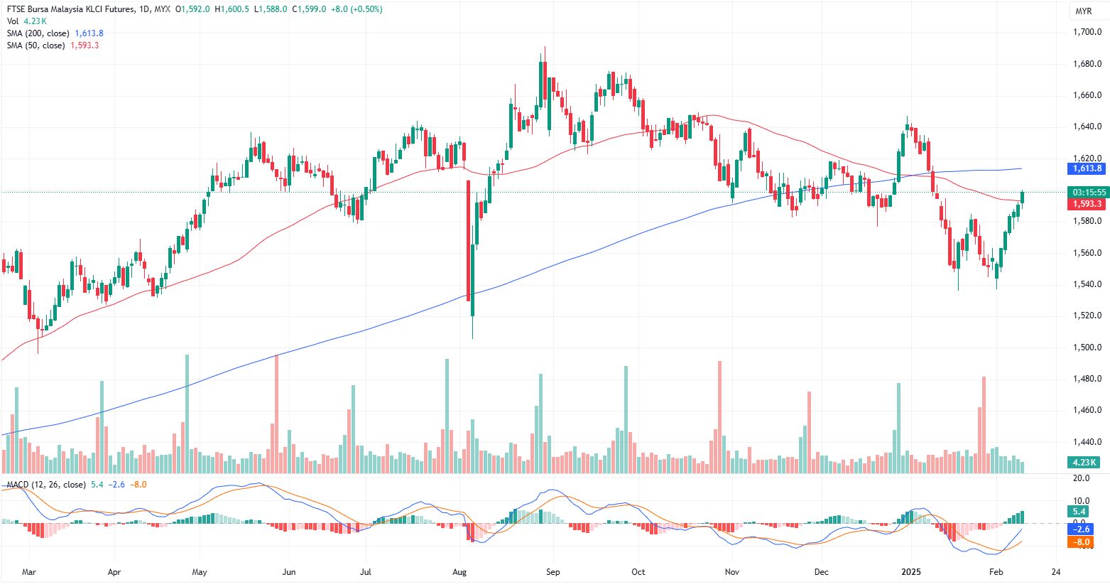 FKLI Feb month rose 8 point or 0.50% to closed higher at 1599 on midday session. The FBM KLCI extended its morning gains, approaching the key psychological level of 1,600.