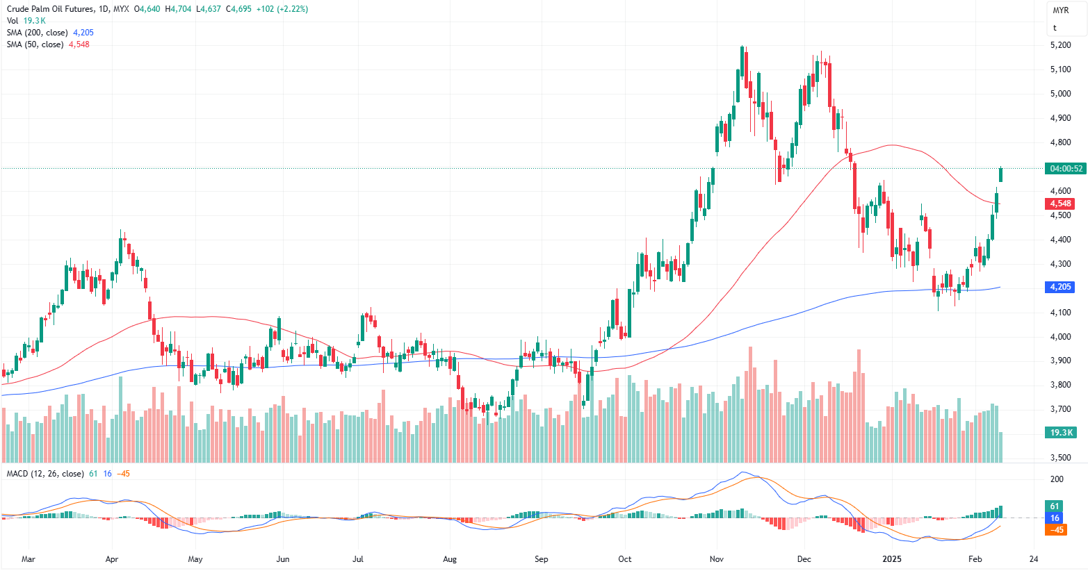 FCPO Apr month surged 102 points or 2.22% to closed higher at 4695 on midday session. Malaysian crude palm oil futures extended gains on Wednesday as trading resumed after a public holiday, driven by stronger prices in competing edible oils.