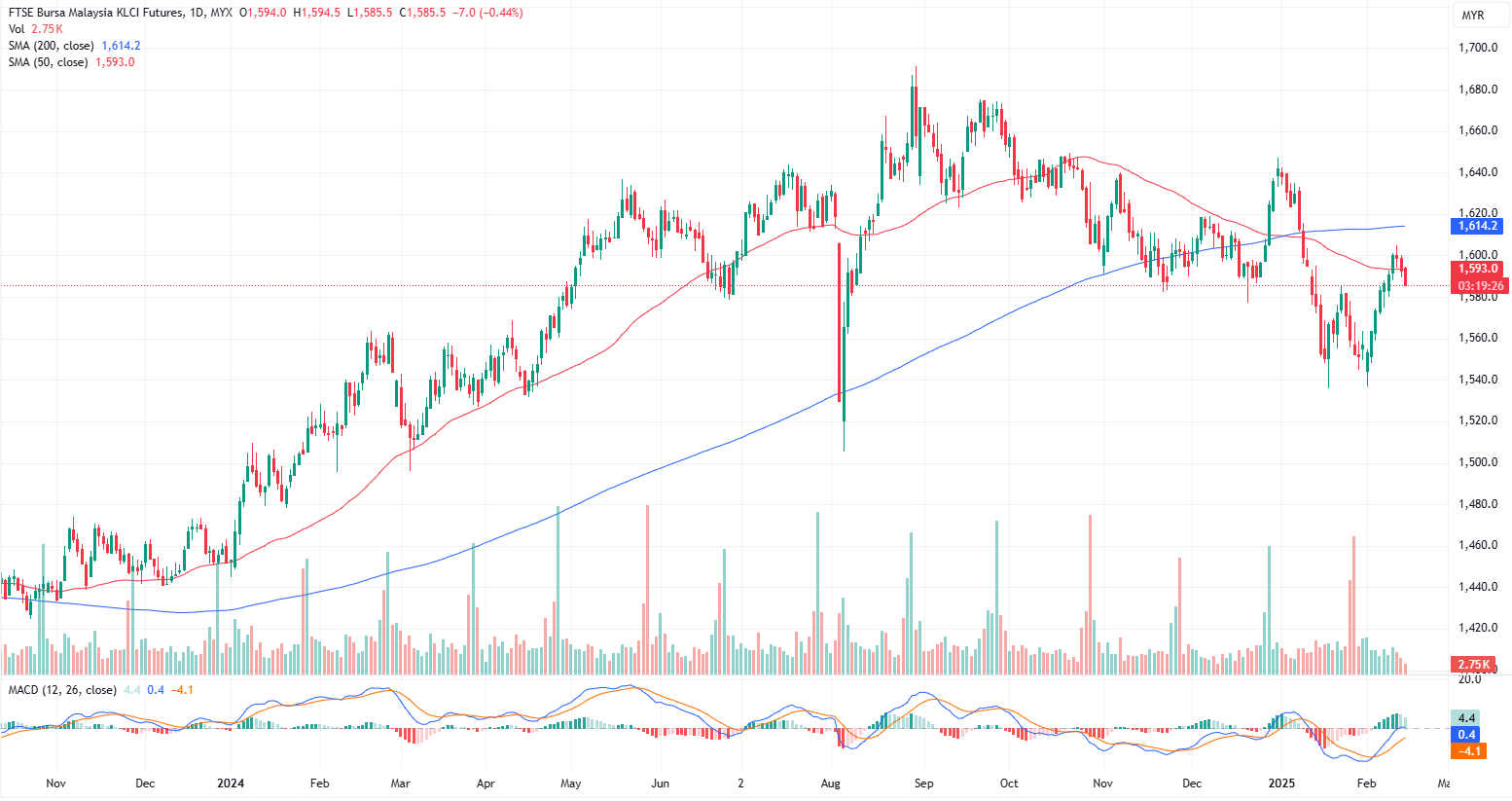 FKLI Feb month dropped 7 points or 0.44% to closed lower at 1585.5 on midday session. The FBM KLCI closed the morning session lower at 1,584.13, down 7.47 points or 0.47%, as market sentiment softened despite a generally positive performance in Asian markets. Selling pressure weighed on Malaysian stocks, with YTL Corp and YTL Power leading the declines.