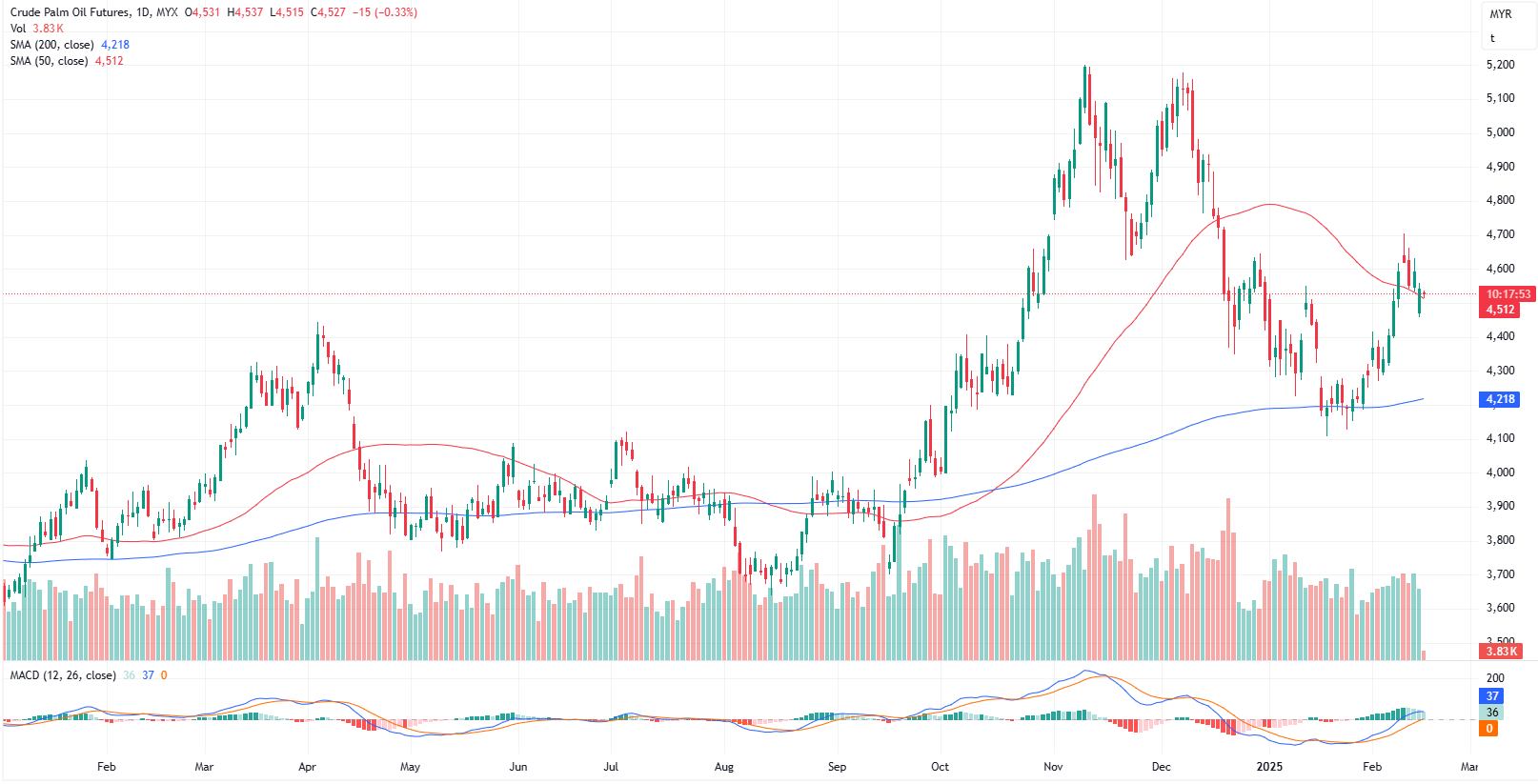 FCPO May month contract rose 43 points or 0.96% to closed higher at 4542. Malaysian crude palm oil futures recovered from earlier losses to close higher on Monday, though gains were limited by weaker soyoil prices and lower palm oil export estimates for the first half of February.