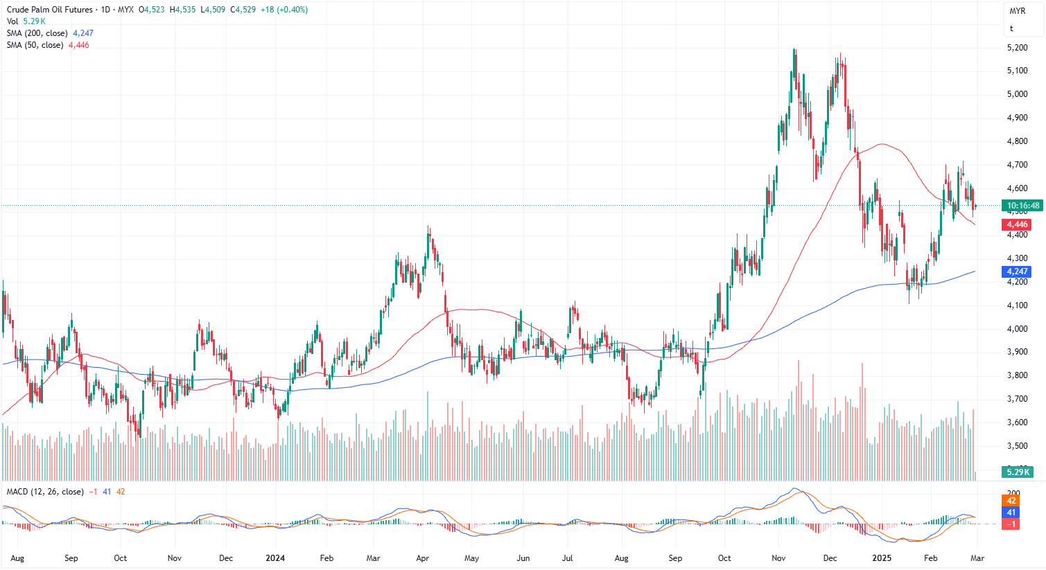 The actively traded FCPO contract remains in sideways consolidation. In the previous session, after opening lower, the price tested the support line of the range at 4,477 before recovering. However, it continues to hover near the lower boundary of the consolidation. The price is now moving toward the immediate resistance range of 4,525 to 4,530. A breakout above this level could lead to further gains toward 4,550 to 4,555, with highs potentially reaching 4,575 to 4,580, while remaining within the sideways trend.