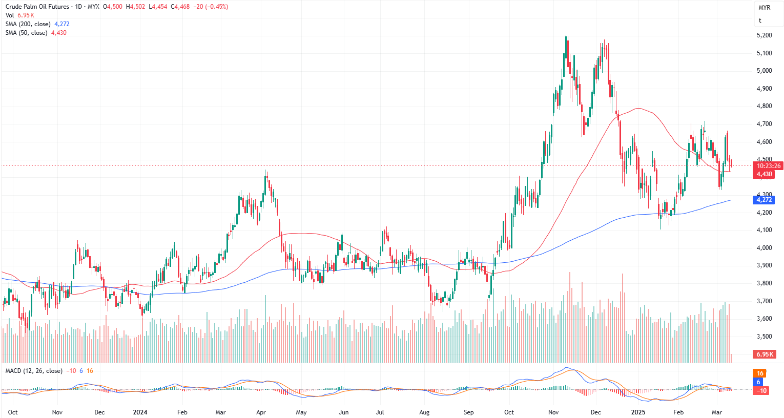 In the previous session, the active palm oil price traded lower but remained within a broad sideways range. Support is seen at 4425–4430, a crucial level for the uptrend that started on March 5. Resistance is noted at 4475–4480, with the price struggling to move higher for now. A consolidation phase with a slight upward bias is likely. If the price breaks above 4480–4485, further upside momentum could follow. However, if it rebounds and fails to break above this level, the price may continue trading lower. Support remains at 4455–4460. Beware of any potential sentiment changes. The immediate support and resistance levels are pinpointed at 4459 and 4481, respectively.