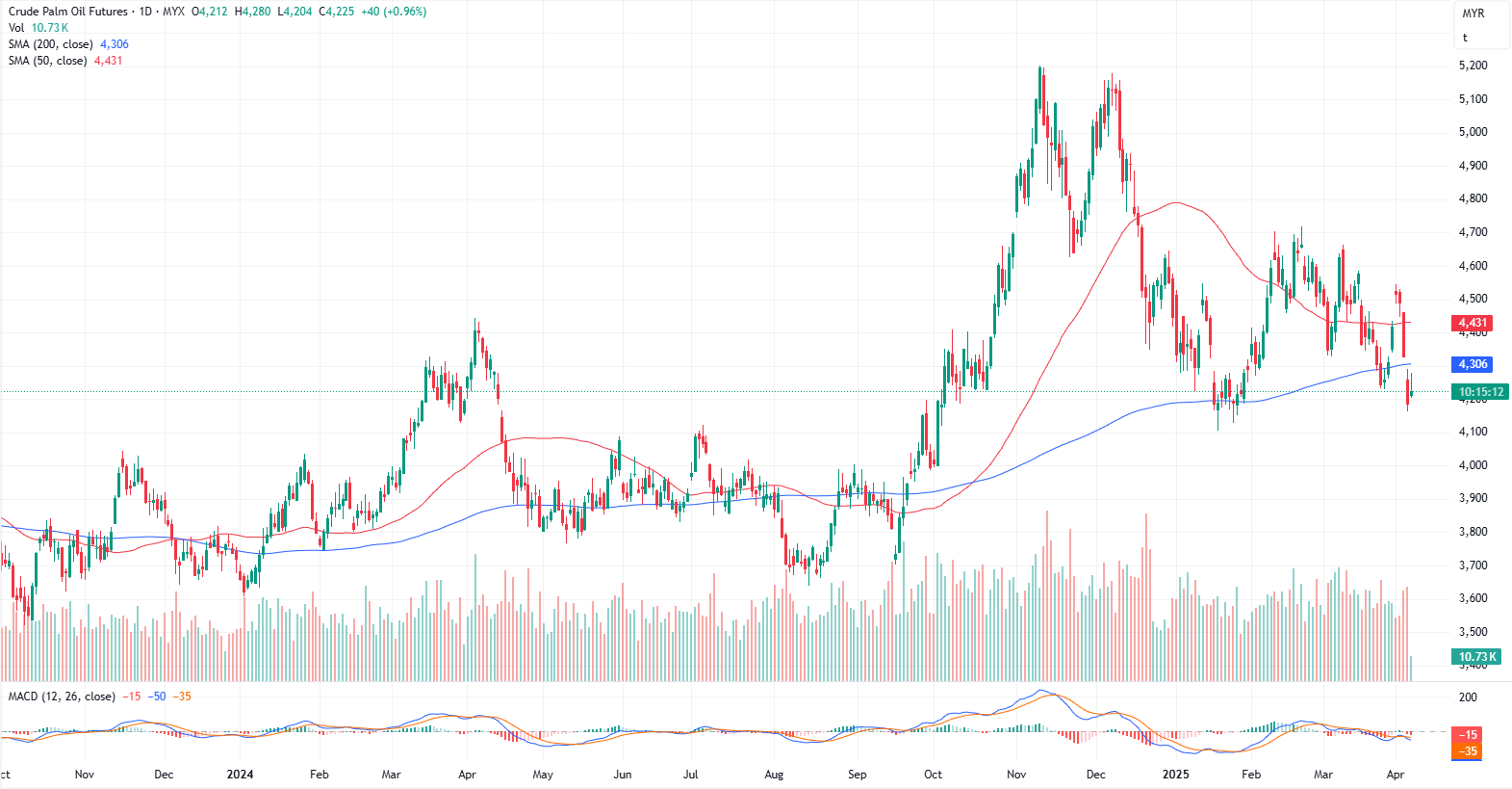 FCPO Jun month dropped 143 points or 3.3% to closed lower at 4185. Malaysian crude palm oil futures dropped to a 10-week low on Monday, weighed down by weaker soyoil and crude oil prices, amid concerns over a global trade war following China's retaliatory tariffs on U.S. goods.