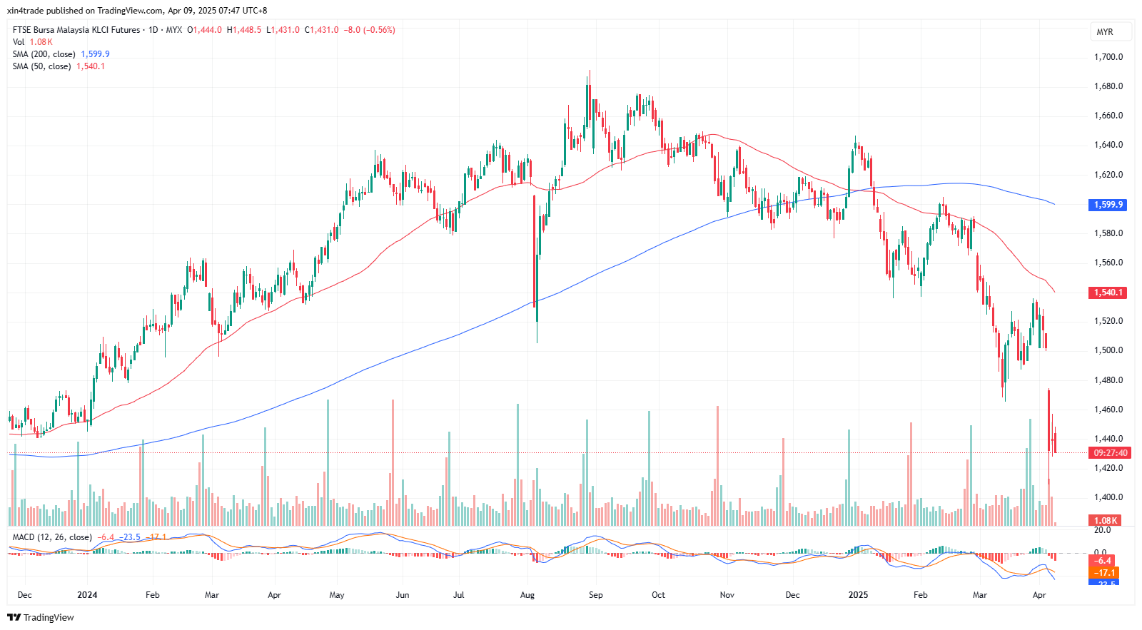 FKLI Apr month rose 6.5 points or 0.45% to closed higher at 1439. The FBM KLCI saw a brief rebound on Tuesday but ended lower, diverging from regional markets. This follows Monday’s sharp selloff, which dragged the index to a 16-month low amid heavy selling pressure.