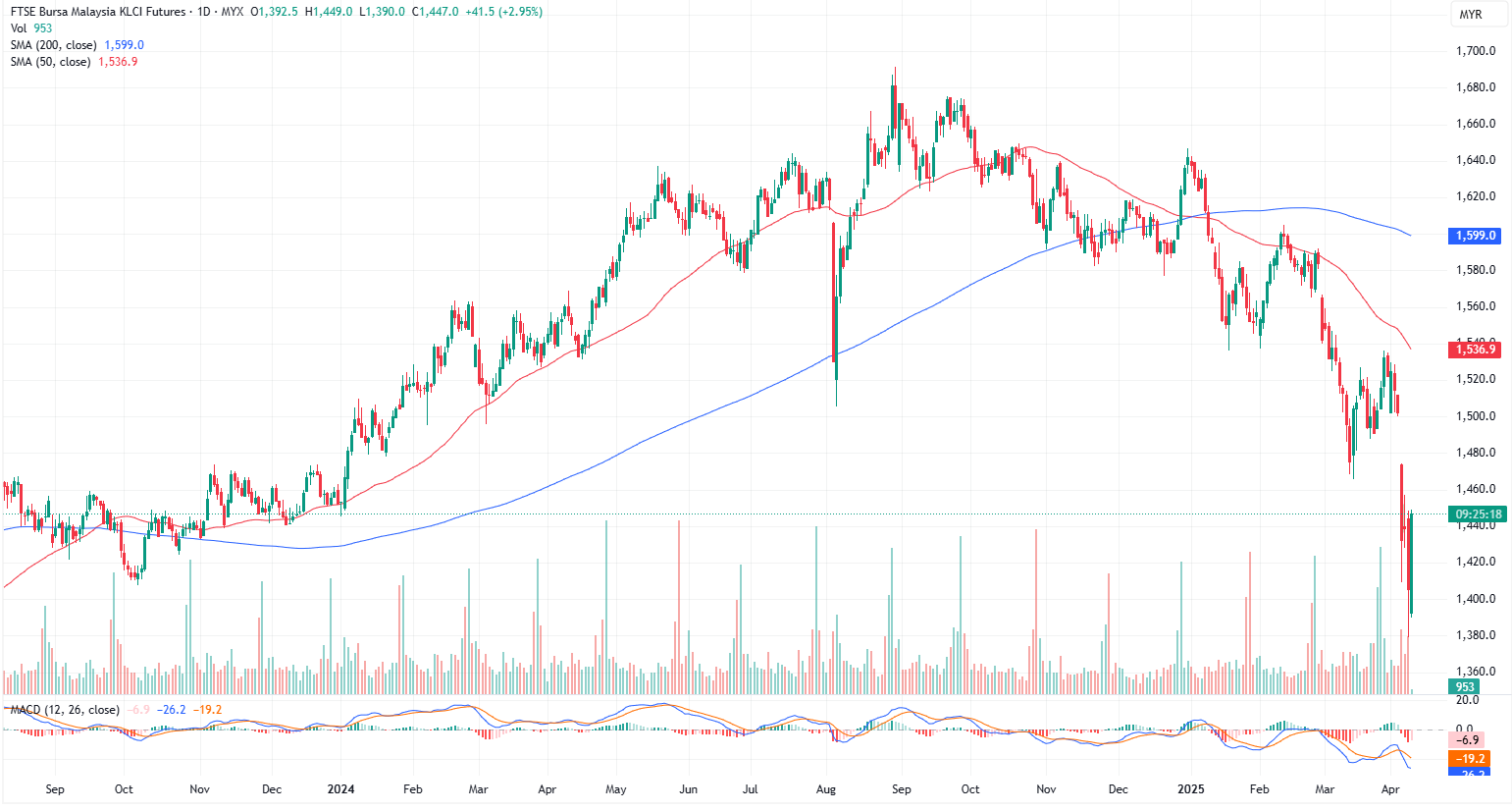 FKLI Apr month slumped 33.5 points or 2.33% to closed higher at 1405.5. The FBM KLCI tumbled again on Wednesday, with over 900 stocks in the red, as escalating tariff tensions between the U.S. and China—two of the world's largest economies—intensified concerns, heightened recession fears, and erased significant market value.