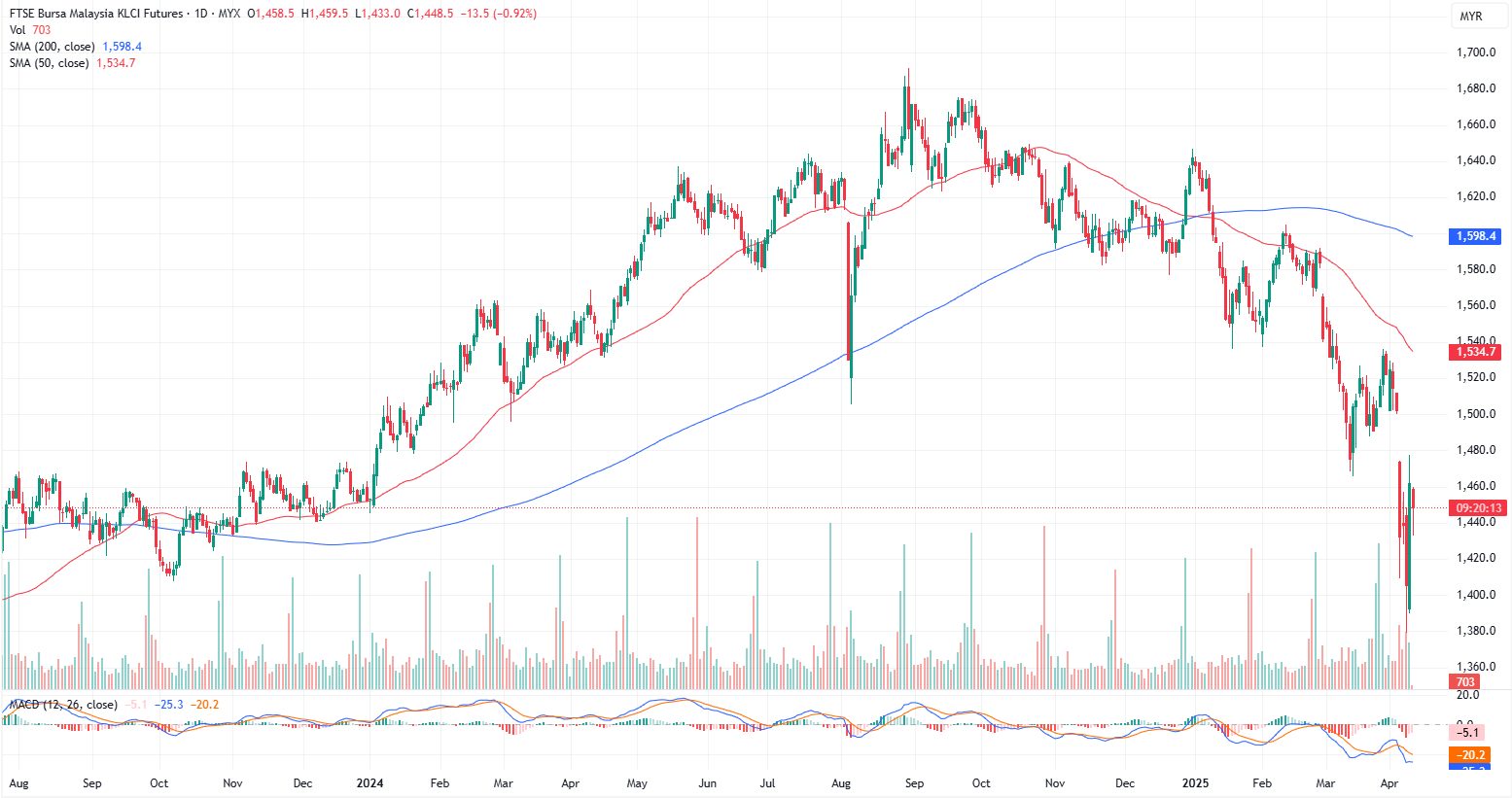 FKLI Apr month surged 56.5 points or 4.02% to closed higher at 1462. The FBM KLCI jumped 4.5% on Thursday as investors rushed to buy beaten-down stocks, spurred by U.S. President Donald Trump’s announcement of an immediate 90-day tariff pause for many countries.