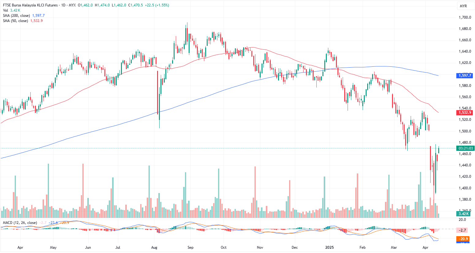 FKLI Apr month rose 22.5 points or 1.55% to closed higher at 1470.5 on midday session. Malaysia’s blue-chip index surged 1.4% at midday, tracking gains across global markets as Trump’s temporary exemption on electronics tariffs boosted sentiment. The FBM KLCI rose 20.68 points to 1,475.44, supported by optimism that the US president may ease earlier tariff proposals.