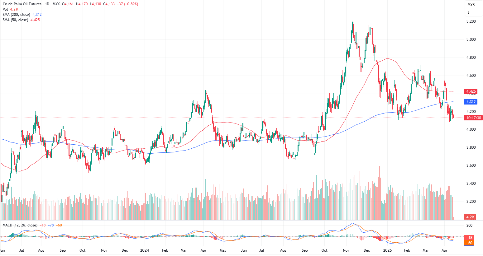 FCPO Jun month dropped 42 points or 1% to closed lower at 4170. Malaysian crude palm oil futures ended lower on Monday, pressured by weakness in rival soyoil on the Chicago market and dampened sentiment due to escalating U.S.-China trade tensions, despite a temporary suspension of tariffs on other nations.