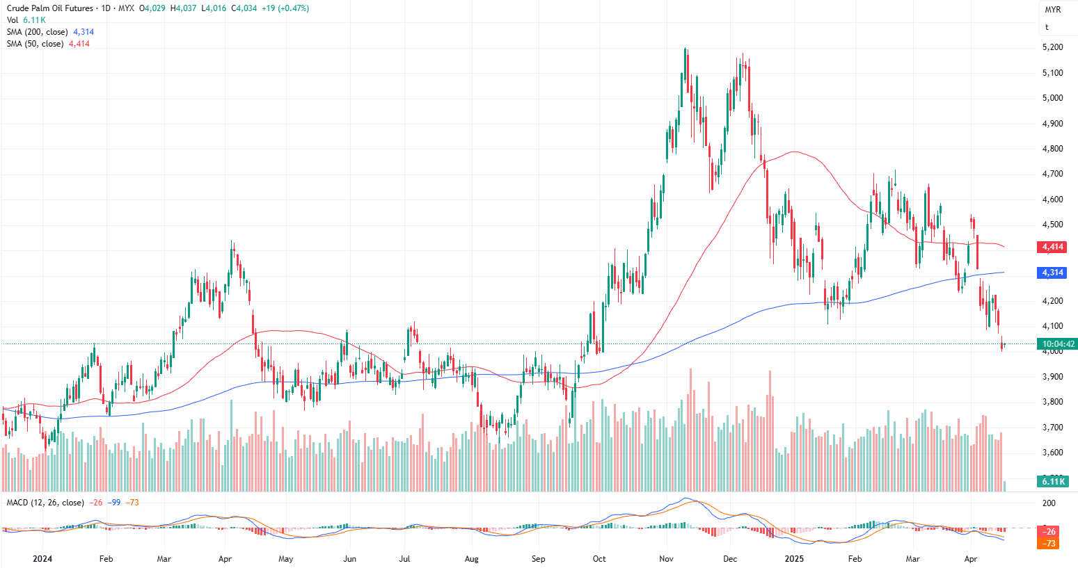 The actively traded FCPO contract on the daily chart continues to show downside momentum after breaking below the 4100–4105 support, the lower boundary of a broad sideways consolidation. This zone now acts as a key resistance area, with immediate resistance seen at 4075–4080 — a potential selling zone if the price rebounds. On the hourly chart, price action shows minor sideways consolidation, with support observed around the 4000–4005 level. This range may trigger short-term buying momentum, with upside potential capped around 4050–4055. A breakdown below 4000 could lead to renewed selling pressure. Beware of any potential sentiment changes. The immediate support and resistance levels are pinpointed at 4026 and 4052, respectively.