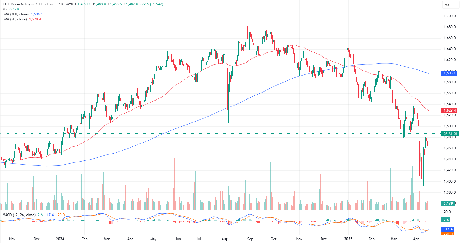 The actively traded FKLI contract has been trading with positive momentum since the opening session, supported above the lower boundary of the sideways range at 1460–1465 and trending higher on the daily chart. With a breakout above the 1475–1477 zone, this area now acts as a new support range. We maintain a buy-on-retracement outlook for the upcoming sessions, with potential upside toward the 1490–1495 level. However, if the index fails to break above the 1487–1489 resistance, it may return to sideways consolidation. Stay cautious of potential shifts in market sentiment. Immediate support and resistance levels are identified at 1475 and 1489 respectively.