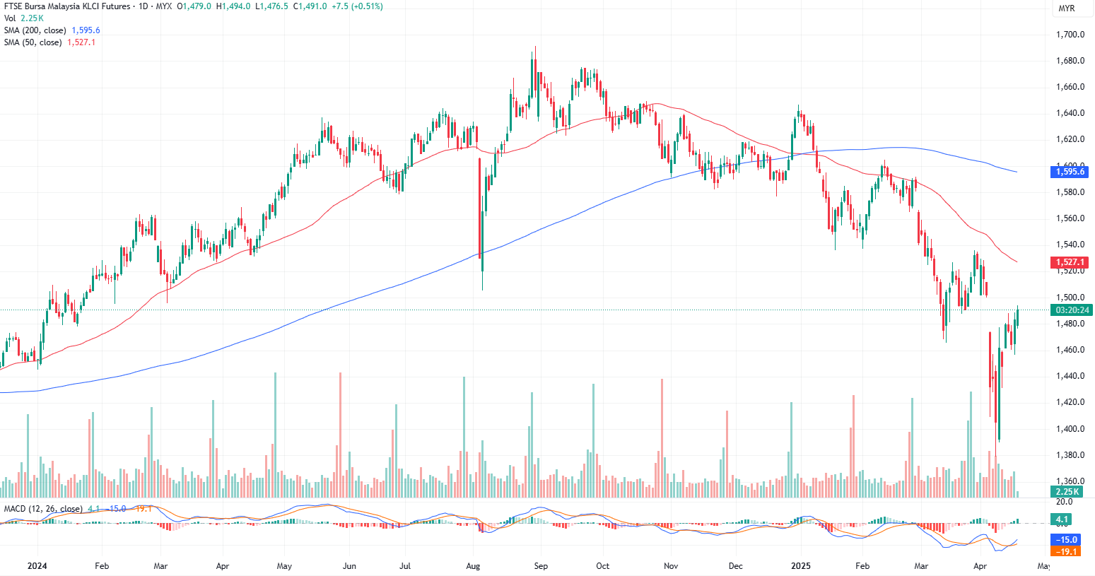 FKLI Apr month rose 7.5 points or 0.51% to closed higher at 1491 on midday session. Positive sentiment across regional markets lifted Bursa Malaysia for another session, as investors continued to bargain-hunt oversold stocks amid a temporary pause in the ongoing tariff saga.