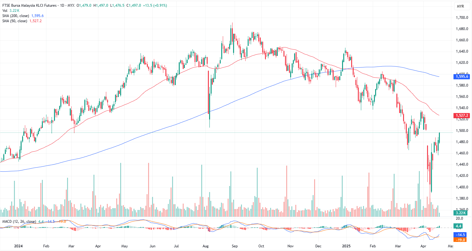 The actively traded FKLI contract remains within a downward channel on the daily chart but has broken above the resistance zone at 1587–1589, which now serves as immediate support. We maintain a buy-on-retracement strategy, with potential upside targets at 1500–1505, possibly extending to around 1515. However, if the index drops back below the immediate support level, selling pressure may resurface. Stay cautious of potential sentiment changes. Immediate support and resistance levels are identified at 1490 and 1500, respectively.