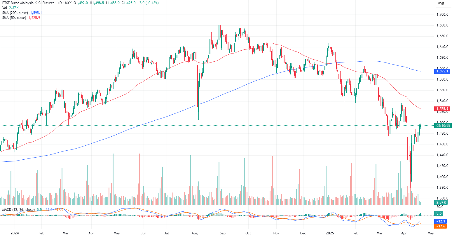 The actively traded FKLI contract remains within a downward channel on the daily chart but has broken above the resistance zone at 1587–1589, which now serves as immediate support. We maintain a buy-on-retracement strategy, with potential upside targets at 1600–1605, possibly extending toward 1615. However, if the index falls back below the immediate support level, renewed selling pressure may emerge. Stay cautious of potential shifts in market sentiment. Immediate support and resistance levels are identified at 1489 and 1494 respectively.