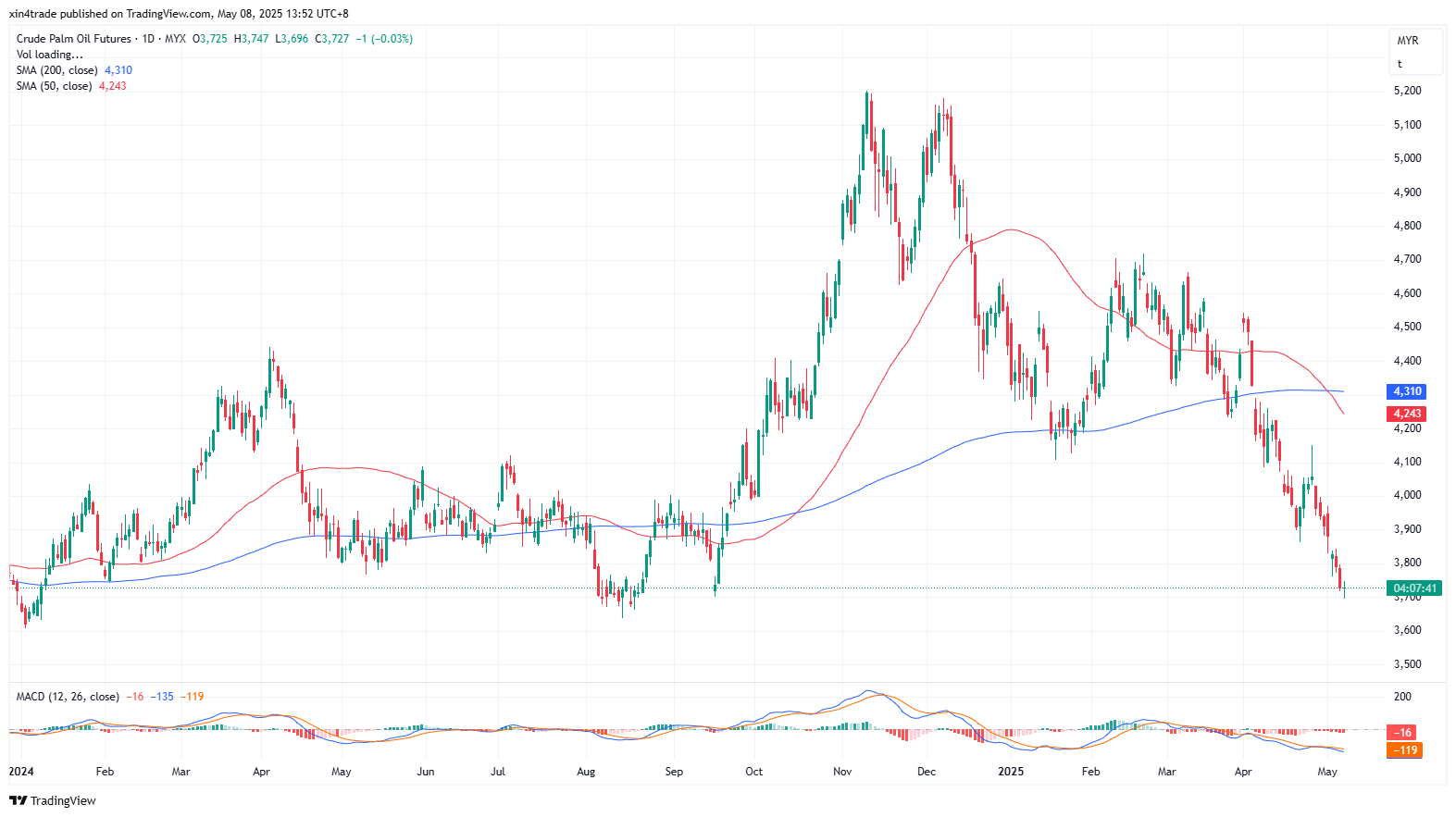 The actively traded FCPO contract continues to hover near the bottom of its downward channel, around the key support zone of 3720 to 3725. If this level holds, we may see some technical buying with potential upside toward the 3875 to 3880 range. However, if the support fails to hold, selling pressure could persist. Stay cautious of potential shifts in market sentiment. The immediate support and resistance levels are identified at 3723 and 3745, respectively.