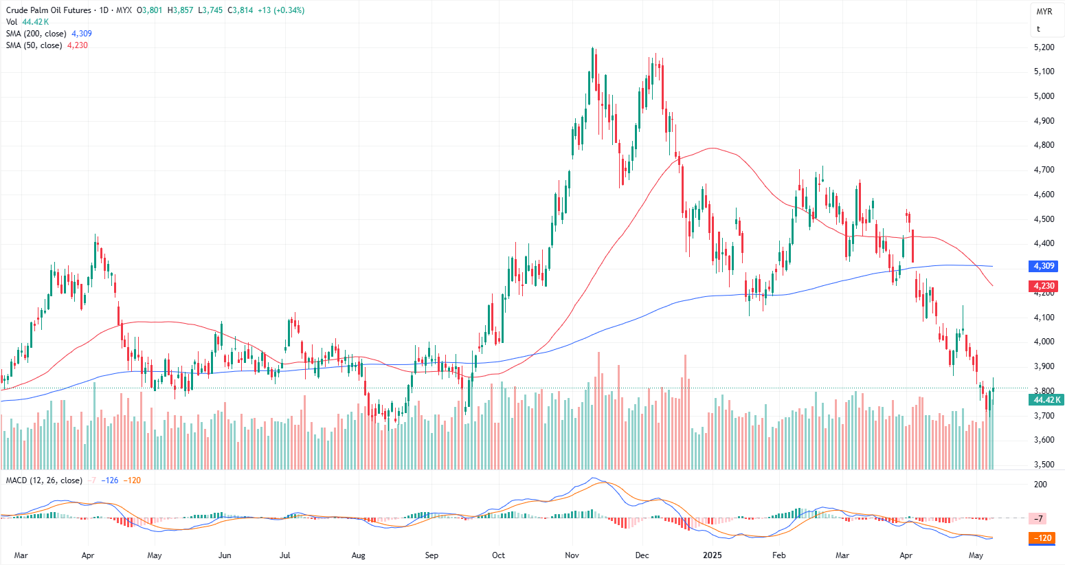 The actively traded FCPO contract continues to move within a broad downward channel. Last week, prices tested the support zone between 3725 and 3730 before rebounding with a technical buying interest, marking two consecutive sessions of gains.