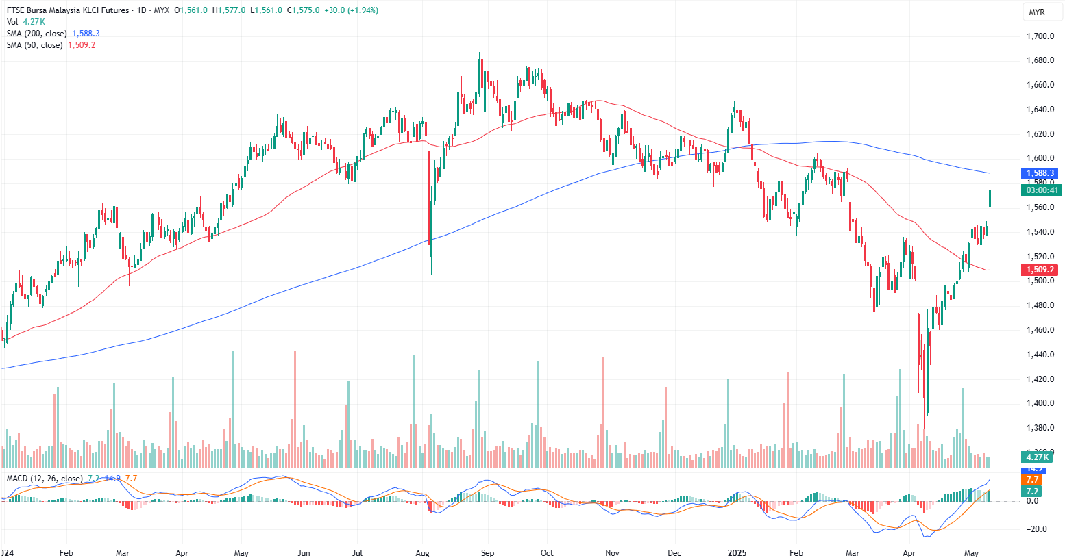 FKLI May month jumped 29.5 points or 1.91% to closed higher at 1574.5 on midday session. Malaysia's blue-chip index surged over 2% in early trade, leading gains across Asia, as upbeat investors snapped up equities following the US-China tariff deal — a major step toward easing tensions in the ongoing trade dispute between the two countries.