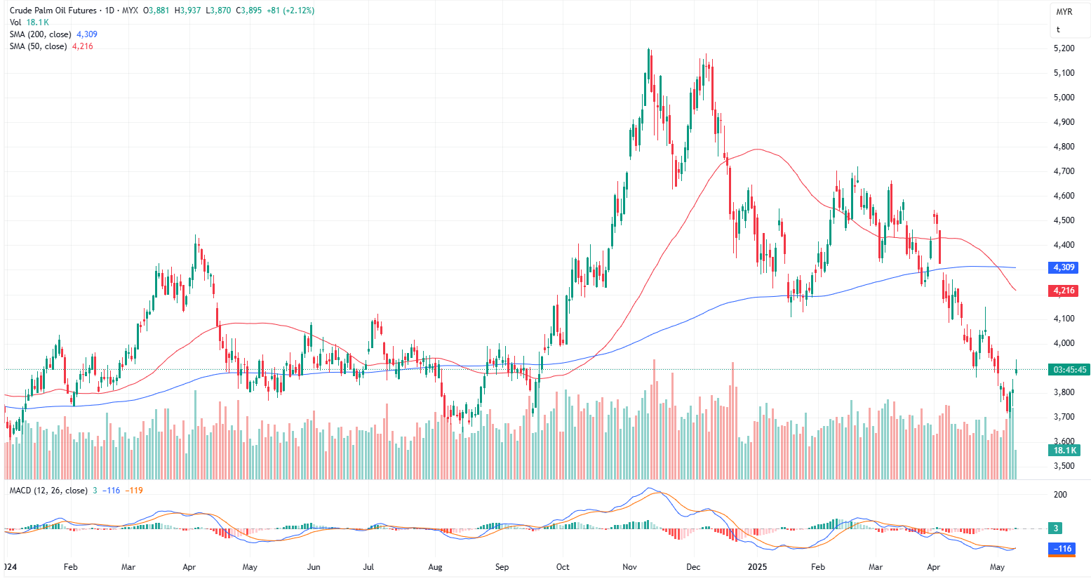 FCPO Jul month rose 81 points or 2.12% to closed higher at 3895 on midday session. Malaysian palm oil futures rose by about 2.0% to approach MYR 3,900 per tonne, marking a third consecutive session of gains as trading resumed following a long weekend.