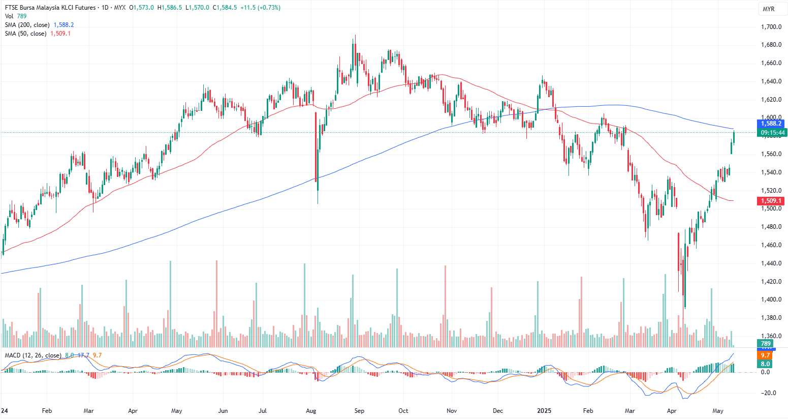 FKLI May month jumped 28 points or 1.81% to closed higher at 1573. The FBM KLCI surged to its highest level in more than two months, lifted by positive momentum from easing U.S.-China trade tensions, providing investors with a much-needed breather.
