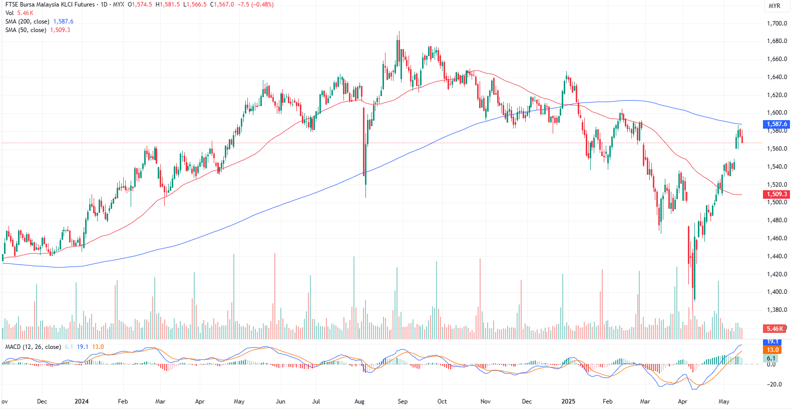The actively traded FKLI contract closed lower in the previous session. From a broader perspective, the index remains within a downward channel and is currently hovering near the resistance zone of that channel. On the hourly chart, the price continues to consolidate sideways, with resistance seen at 1584–1586 and support at 1560–1562. Immediate support lies at 1566–1567 — if this level holds, a buying opportunity may emerge. However, a break below this support could trigger further selling. Overall, we maintain our primary strategy of "sell on rebound" for the upcoming session. Beware of any potential sentiment changes. Immediate support and resistance levels are identified at 1566 and 1572, respectively.