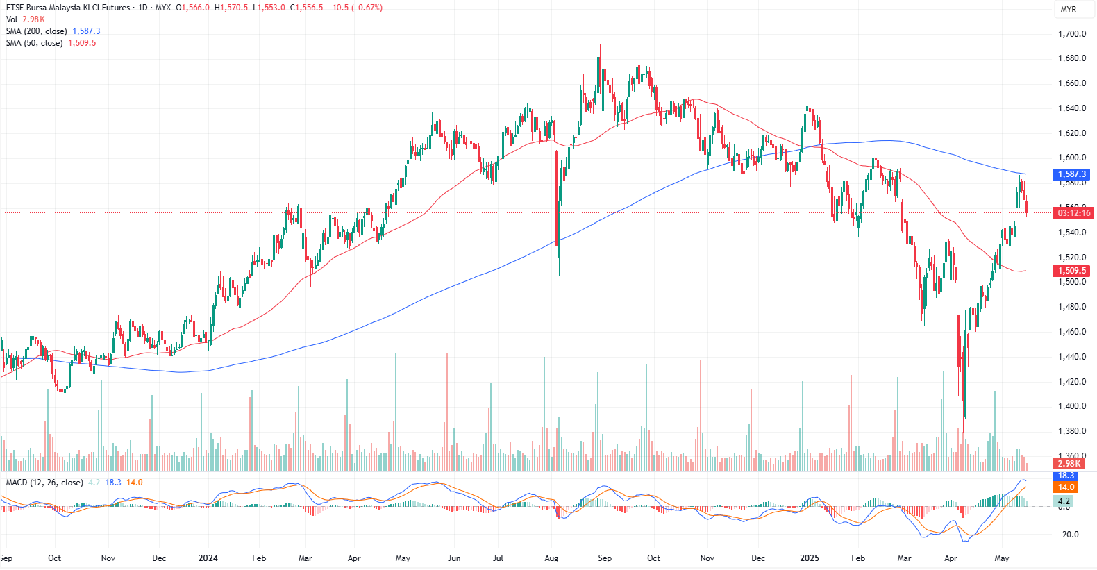 The actively traded FKLI contract closed lower in the previous session. From a broader perspective, the index continues to trade within a downward channel and has recently broken below a key support zone at the 1560–1562 range, which now acts as a resistance area. We maintain our primary "sell on rebound" strategy for the upcoming session, as long as the index fails to break back above this resistance. However, if a recovery pushes the index above this resistance level, a buy opportunity may be considered. Stay cautious of potential shifts in market sentiment. Immediate support and resistance levels are identified at 1553 and 1560 respectively.