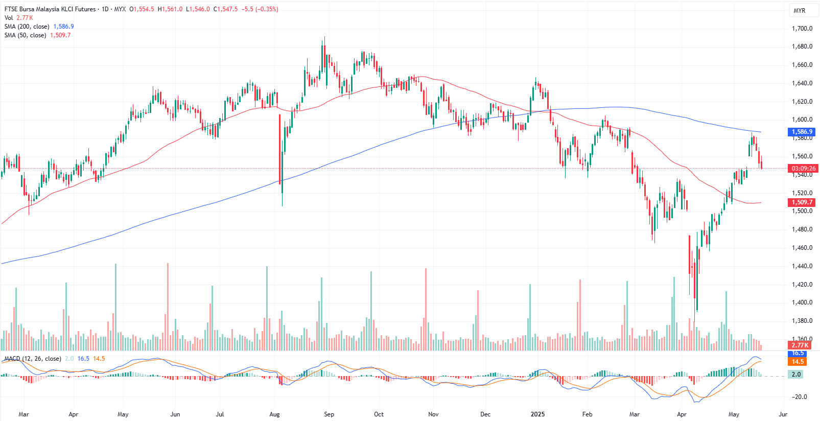 The actively traded FKLI contract continued to trade lower. From a broader perspective, the index remains within a downward channel and has recently broken below a new support zone at 1562–1560, which now acts as a key resistance area. On the hourly chart, we observe sideways consolidation with a downward bias. We maintain a sell-on-rebound strategy, where a retracement toward the 1550–1552 resistance zone may offer selling opportunities. However, if the index holds above this range, further technical buying could emerge. Stay cautious of potential shifts in market sentiment. Immediate support and resistance levels are identified at 1547 and 1552 respectively.