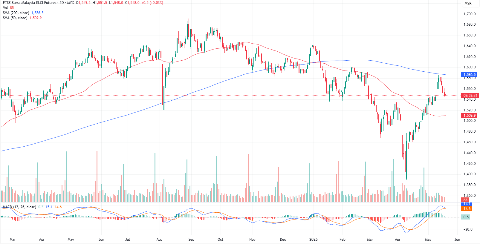 FKLI May month dropped 5.5 points or 0.35% to closed lower at 1547.5. The FTSE Bursa Malaysia KLCI (FBM KLCI) futures contract closed lower on Tuesday, mirroring the decline in the underlying cash market.