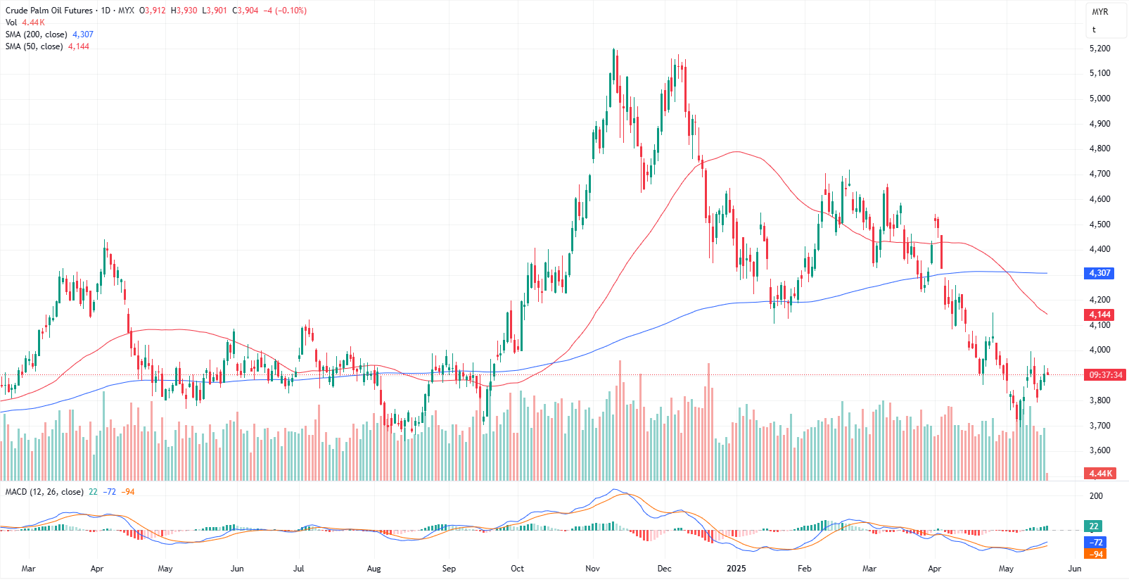 The actively traded FCPO contract continues to trend within a downward channel from a broader perspective. In the previous session, prices struggled to break above the 3940–3945 resistance range, capping further upside. However, on the lower end, we observed support forming around the 3895–3890 zone. If this support holds, we maintain our buy-on-retracement strategy, with potential upside revisiting the 3940–3945 area. That said, a break below the 3895–3890 support range may trigger renewed selling pressure. Beware of any potential sentiment changes. The immediate support and resistance levels are pinpointed at 3903 and 3921, respectively.